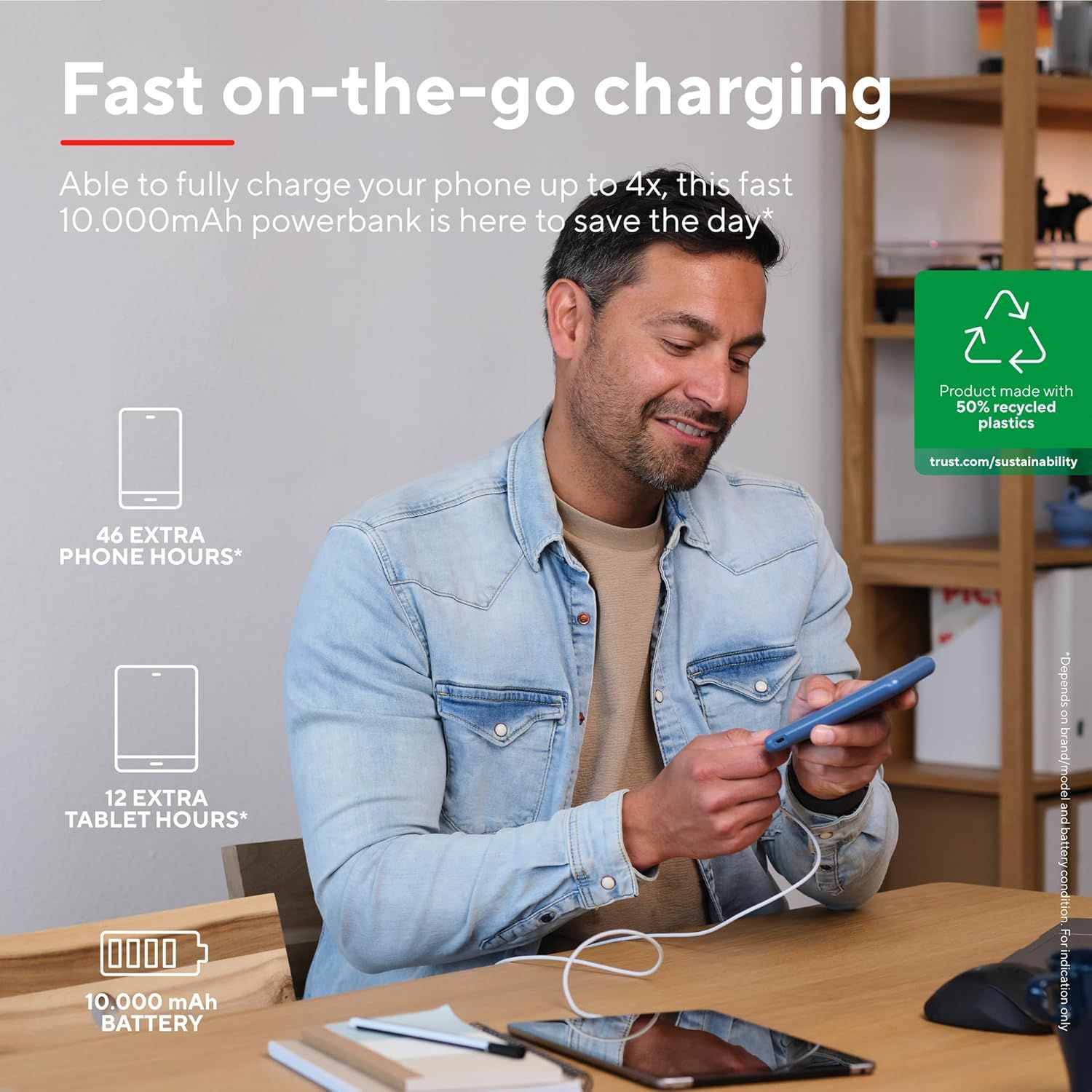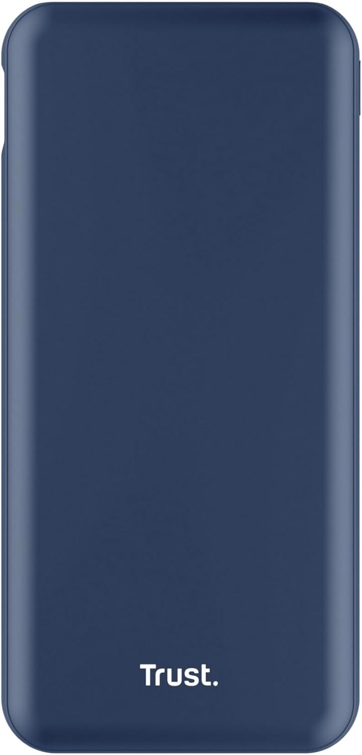 Power Bank Trust Redoh (25032_TRUST) — портативний акумулятор на 10000 мА·год (37 Вт·год) з трьома портами (1x USB-A, 2x USB-C), підтримкою швидкої зарядки 18 Вт (QC 3.0, PD 2.0). Виготовлений із 50% переробленого пластику (ABS/PC), вага 231 г, розміри 69x144x16 мм. LED-індикатори рівня заряду, захист від перезаряду. Зарядний кабель USB-A до USB-C у комплекті, сумісний зі смартфонами та планшетами. Синій колір.