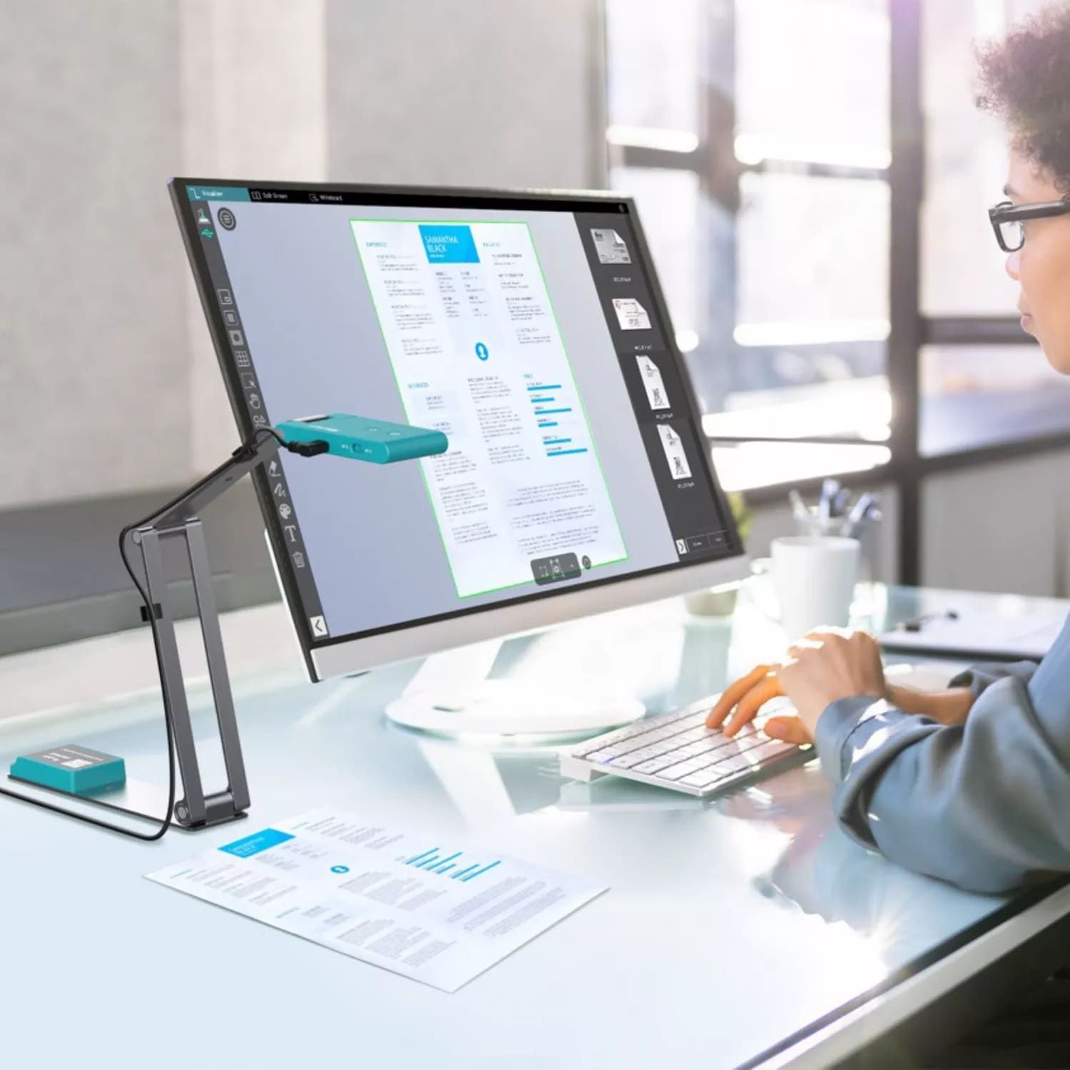 IRIScan Visualizer 7 — це портативний документ-сканер і камера 2-в-1, що поєднує функції вебкамери, документ-камери та стримінгового пристрою. Підтримує відео 4K при 30 кадрах за секунду та оснащений 13-мегапіксельним сенсором для оцифровки документів, буклетів і карток. Пристрій сумісний з популярними платформами для відеоконференцій і постачається з програмним забезпеченням Readiris Visual для навчання та презентацій.