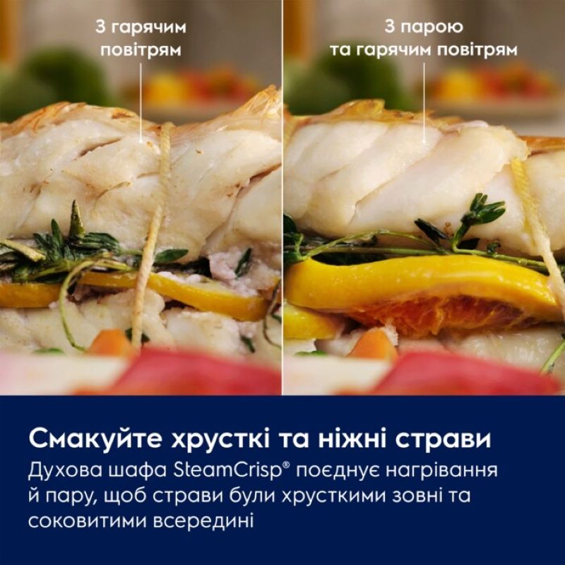 Можливості:таймер, індикатор залишкового тепла, електронне регулювання температури, багатомовний дисплей, SteamCrisp, автоматична рекомендація температури, електронна функція блокування, функція швидкого нагрівання духової шафи, датчик продуктів: автоматичне вимкнення, 3 рівні приготування, функція пам’яті для часто використовуваних параметрів духової шафи, термощуп для м'яса, функція продовження часу приготування