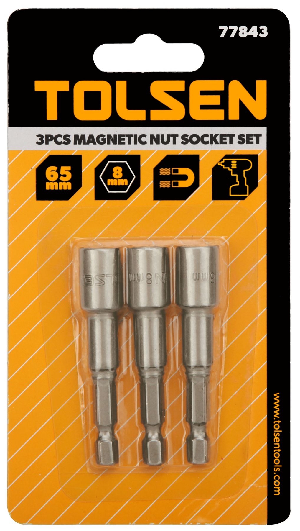Головки торцеві Tolsen магнітні, набір 3шт, 1/4"х65мм, 8мм, сталі 40Cr