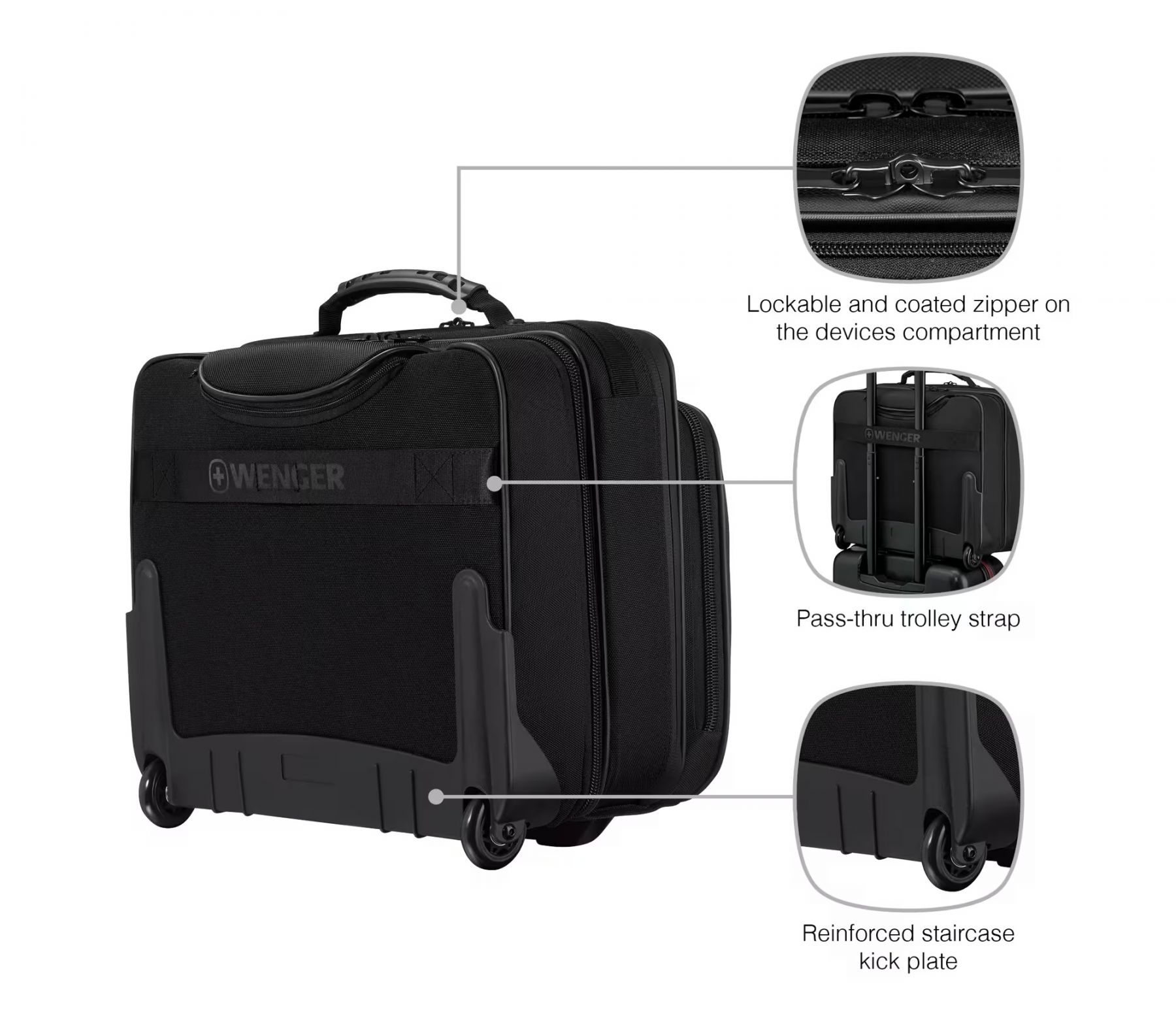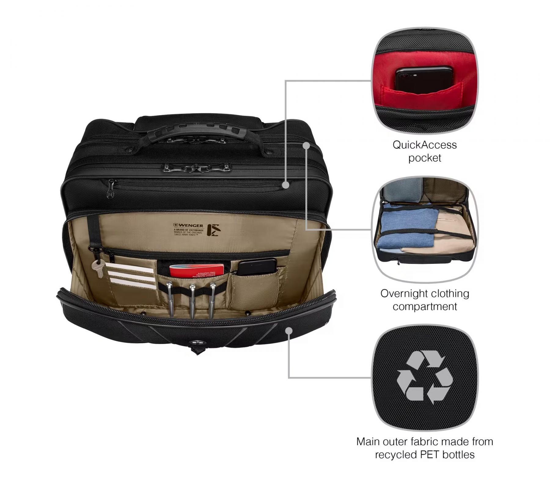 Підвищуйте рівень своїх ділових подорожей із кейс-пілотом Wenger Legacy Black Series. Виготовлений із перероблених матеріалів, він поєднує елегантність, екологічність і функціональність. М’яке відділення з потрійним захистом Triple Protect гарантує безпеку ноутбука до 16". Зручна телескопічна ручка та безшумні колеса забезпечують легке пересування навіть у людних аеропортах. Ідеальний вибір для сучасних професіоналів, що цінують комфорт і стиль.