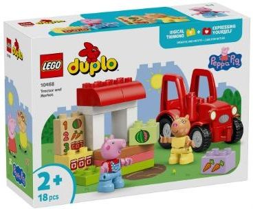 Конструктор LEGO DUPLO 10468 Peppa Pig Трактор і ринок переносить малюків у світ Peppa Pig. Діти можуть грати у фермерський магазин і керувати трактором. У наборі є фігурки Пеппи та Педро й тематичні аксесуари. Гра допомагає розвивати уяву та навички рахунку. Підходить для раннього навчання через гру.