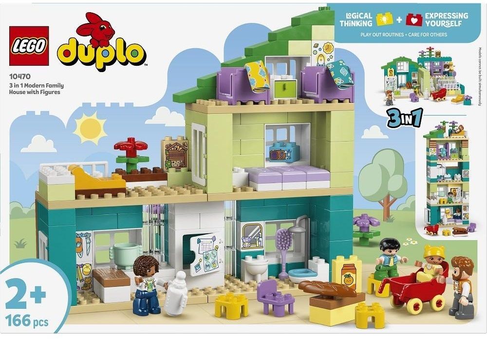 Діти віком від 2 років можуть насолоджуватися творчими іграми, досліджуючи буденні сімейні справи за допомогою набору для конструювання «3-в-1 Сучасний родинний будинок із фігурками» (10470). Завдяки 4 фігуркам — 2 батькам, малюку та немовляті — ця інтерактивна іграшка дозволяє малюкам насолоджуватися соціальними та емоційними навчальними заняттями, граючись із мешканцями лялькового будиночка. Ця універсальна іграшка для розвитку дрібної моторики відкриває безліч творчих можливостей, адже дівчатка і хлопчики можуть побудувати 3 моделі з одного й того самого набору кубиків LEGO® DUPLO®. Вони можуть облаштувати квартиру на одному поверсі або ж 3- чи 5-поверховий ляльковий будиночок із садом на даху та аксесуарами, як-от шезлонг і готель для комах.