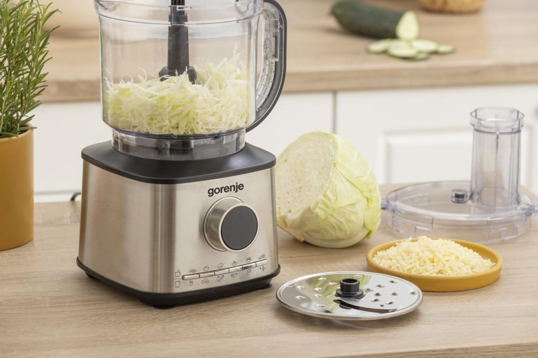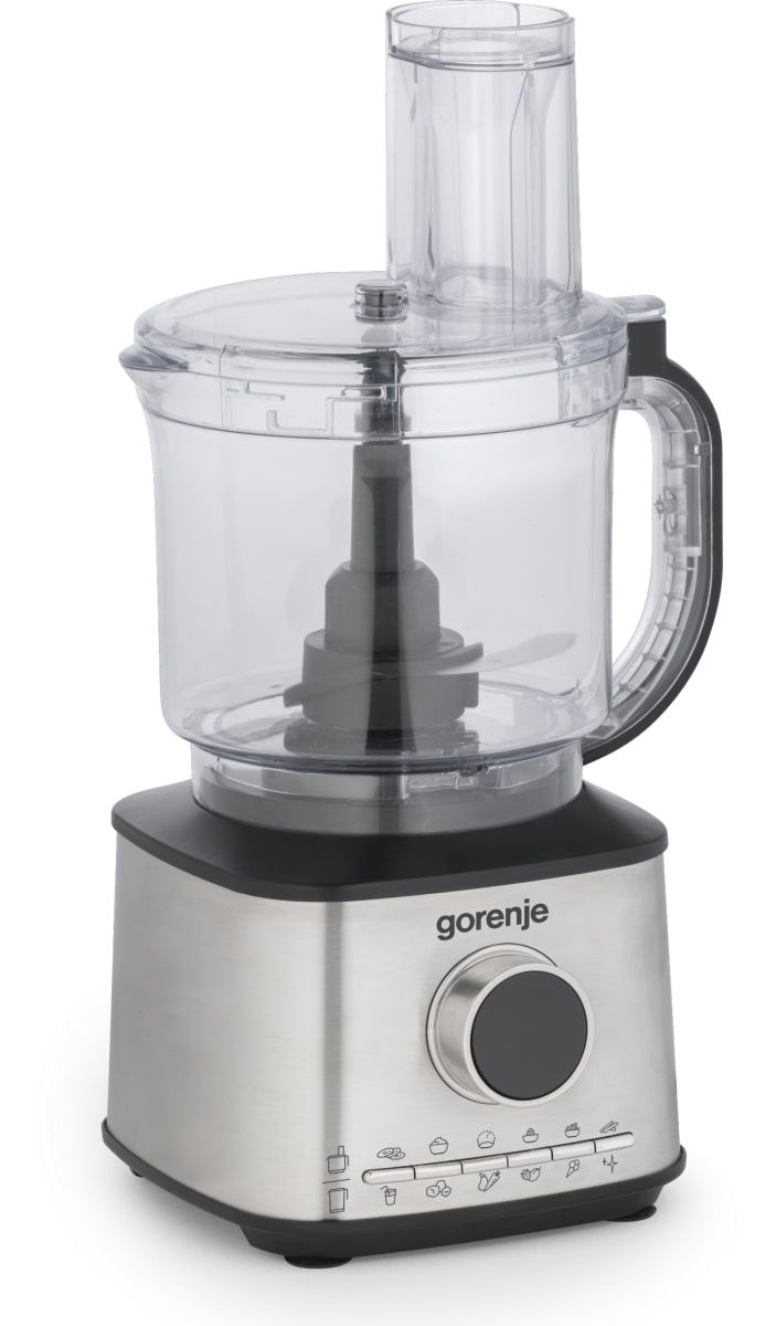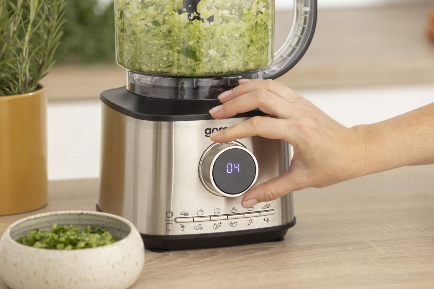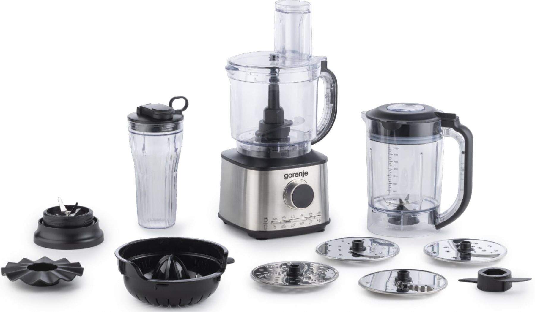 Кухонний комбайн Gorenje 2-в-1 з Fusion Mode: комбайн і блендер в одному, 12 автопрограм (6 кнопок) та 10-швидкісний регулятор. AC-двигун 1500 Вт, чаша 2,0 л, глечик 1,75 л, LED-дисплей. Повний набір насадок, знімні деталі придатні для миття в посудомийці, є блокування та захист від перегріву.