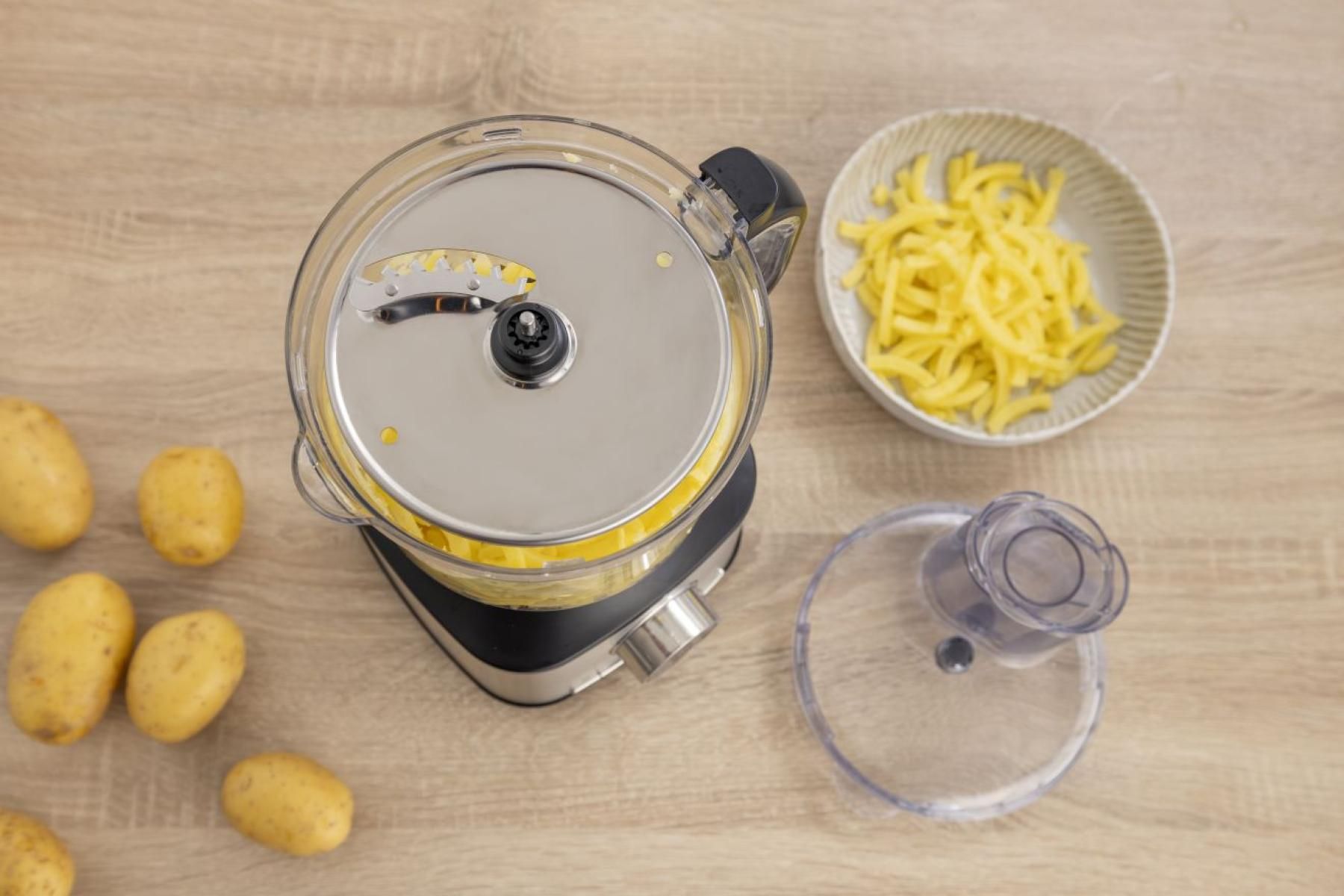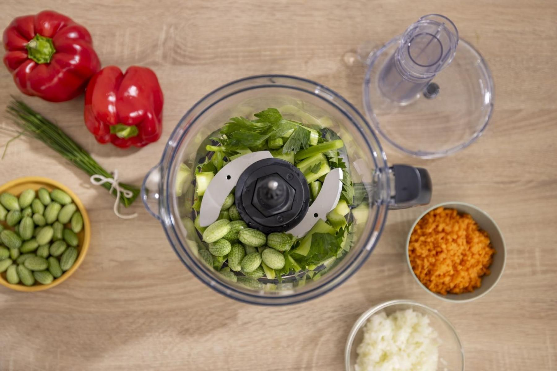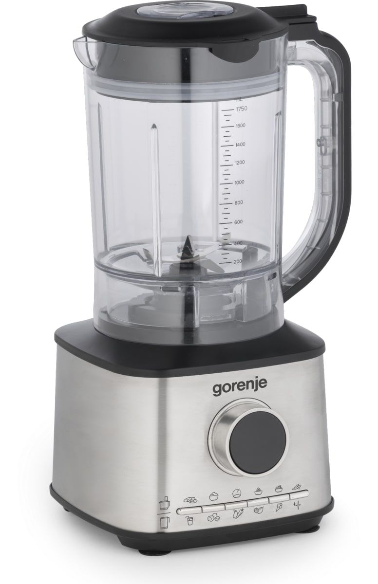 Кухонний комбайн Gorenje 2-в-1 з Fusion Mode: комбайн і блендер в одному, 12 автопрограм (6 кнопок) та 10-швидкісний регулятор. AC-двигун 1500 Вт, чаша 2,0 л, глечик 1,75 л, LED-дисплей. Повний набір насадок, знімні деталі придатні для миття в посудомийці, є блокування та захист від перегріву.