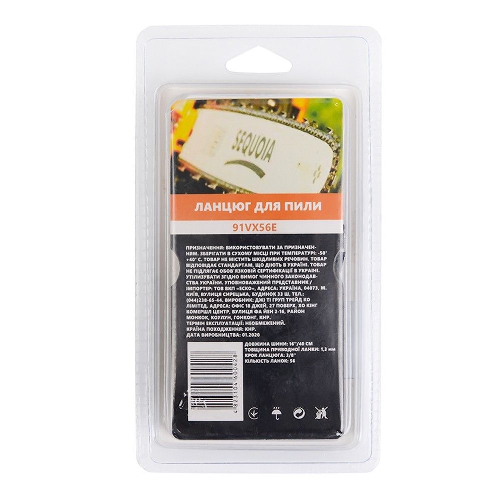 Ланцюг SEQUOIA 91VX56E призначений для бензопил із шиною 40 см. Крок ланцюга становить 3/8", а товщина приводної ланки — 1,3 мм. Модель має 56 ланок і підходить для заготівлі дров, обрізання гілок та стандартних господарських робіт. Тип ланцюга 91VX забезпечує надійну роботу в побутових умовах. Ланцюг виготовлено для тривалого використання.