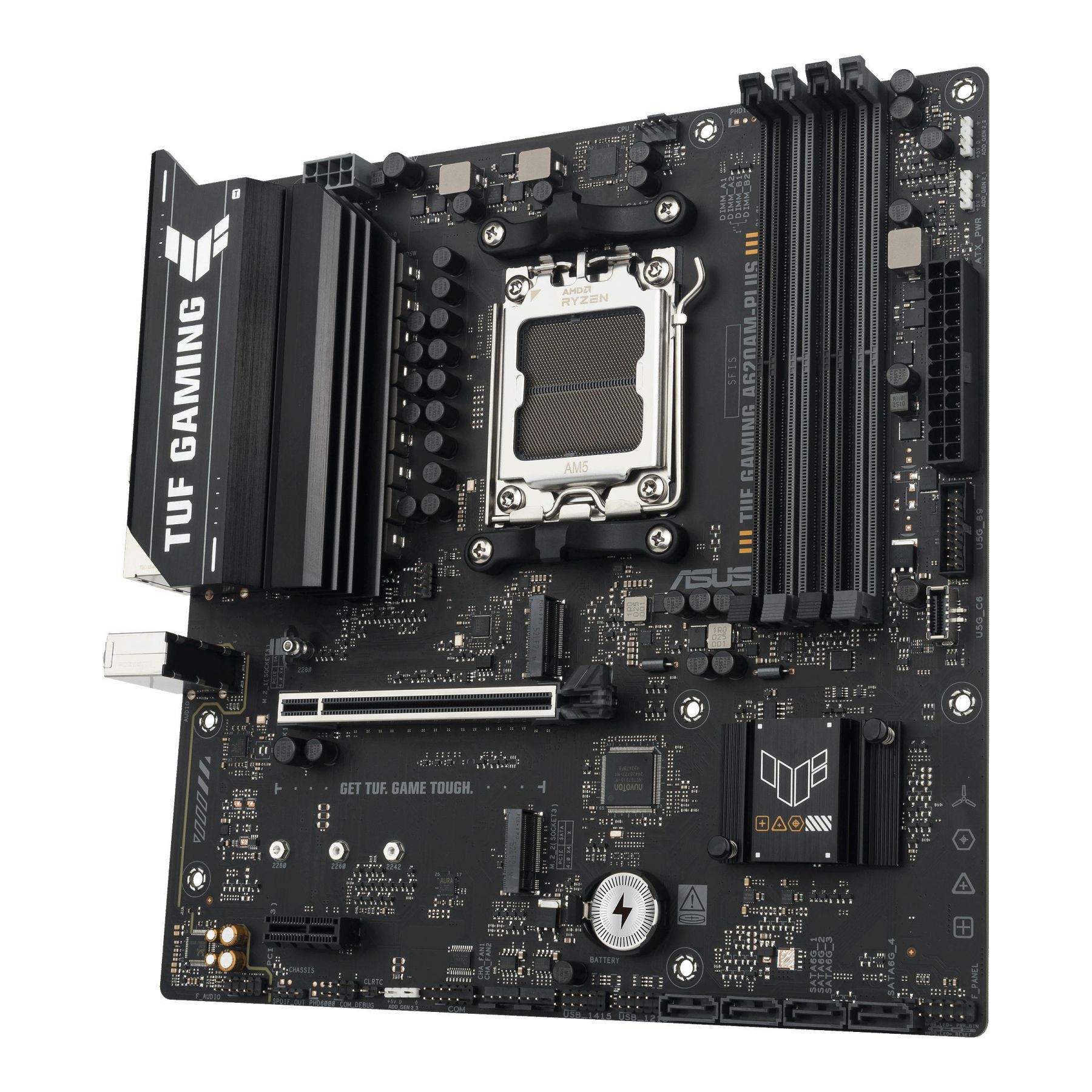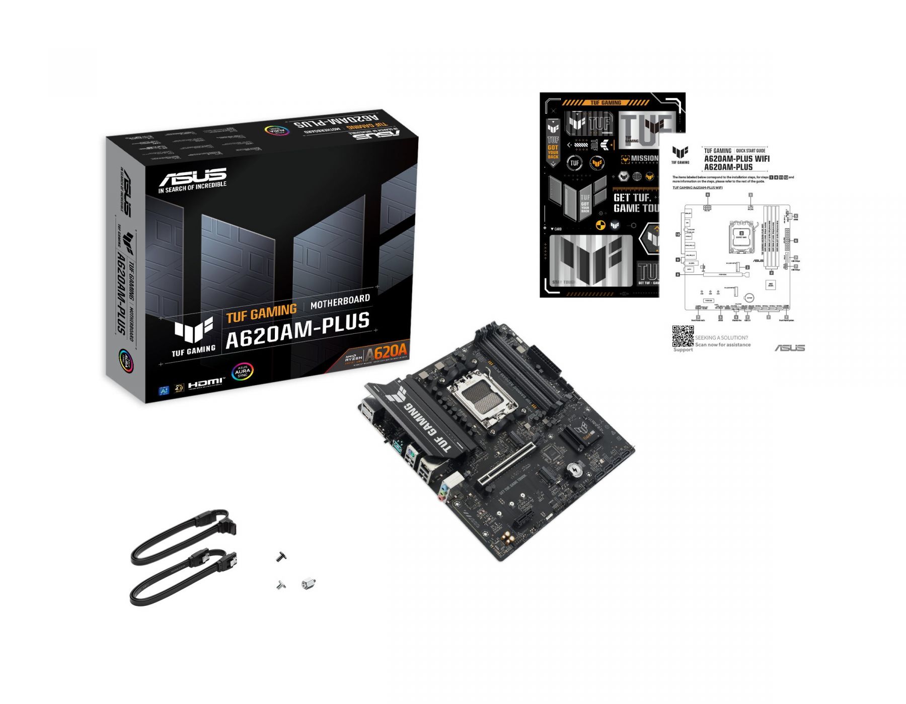 ASUS TUF GAMING A620AM-PLUS — надійна материнська плата формату micro-ATX для процесорів AMD Ryzen серій 9000, 8000 та 7000. Вона поєднує міцну 8+2+1 фазну схему живлення, підтримання DDR5 до 256 ГБ, інтерфейс PCIe 4.0 та два слоти M.2 із високою швидкістю передавання даних. Мережа 2.5 Гбіт, потужне охолодження, Aura Sync і перевірена витривалість TUF забезпечують стабільність у тривалих ігрових сесіях.