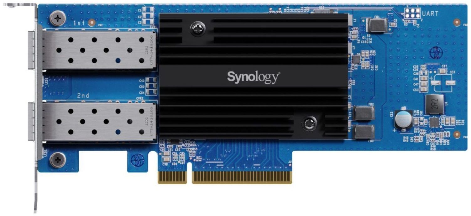 Мережева карта Synology E25G30-F2 з інтерфейсом PCIe 3.0 x8 підтримує швидкість 25 Gbps/10 Gbps з двома портами SFP28. Сумісна з IEEE 802.3by 25GbE та 802.3ae 10GbE, розміри 69 x 168 x 17,3 мм. Підтримує агрегацію каналів для 50 Gbps, Jumbo Frame 1,5–9 КБ та SR-IOV.