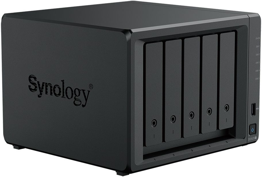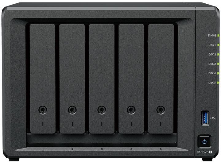 Synology DiskStation DS1525+ – це 5-дискове NAS-сховище з чотириядерним процесором AMD Ryzen V1500B та 8 ГБ DDR4 ECC пам’яті (розширюється до 32 ГБ). Підтримує HDD, SSD та NVMe-диски для кешування, з можливістю масштабування до 15 відсіків через два модулі DX525. Має два 2.5GbE порти, два USB 3.2, два роз’єми USB-C для розширення та слот PCIe для оновлення мережі.
