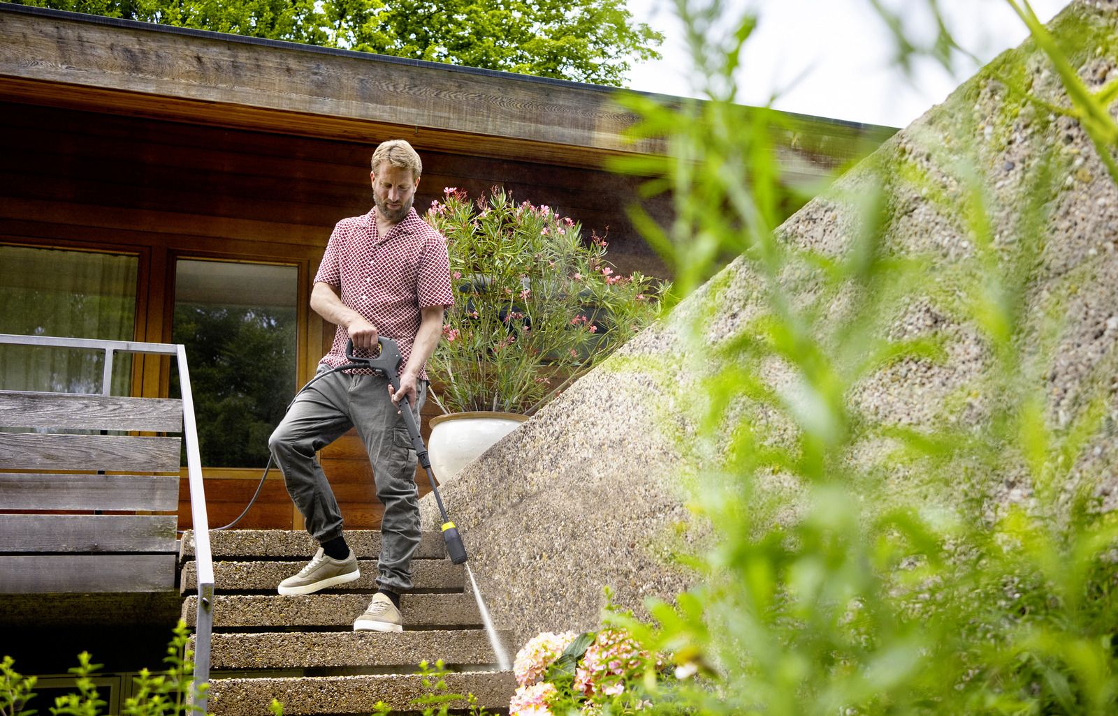 Особливості:вбудований барабан для шланга високого тиску, телескопічне руків’я, система швидкого під’єднання, регулювання режимів струменя, система подавання мийного засобу