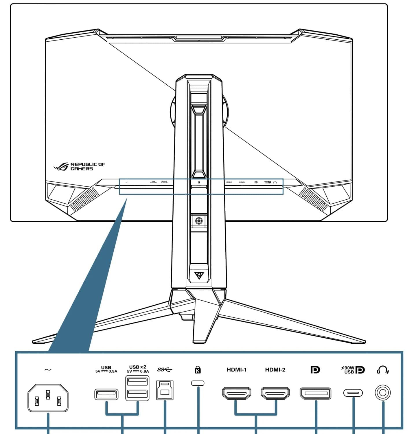 Комплектація:Гарантійний талон, адаптер живлення, Шнур живлення, Кабель DisplayPort, серветка з мікрофібри, короткий посібник користувача, наклейка ROG, Звіт про попереднє калібрування кольору, Кабель USB 3.2, Комплект кріплення VESA, Надшвидкісний кабель HDMI, Сумка ROG