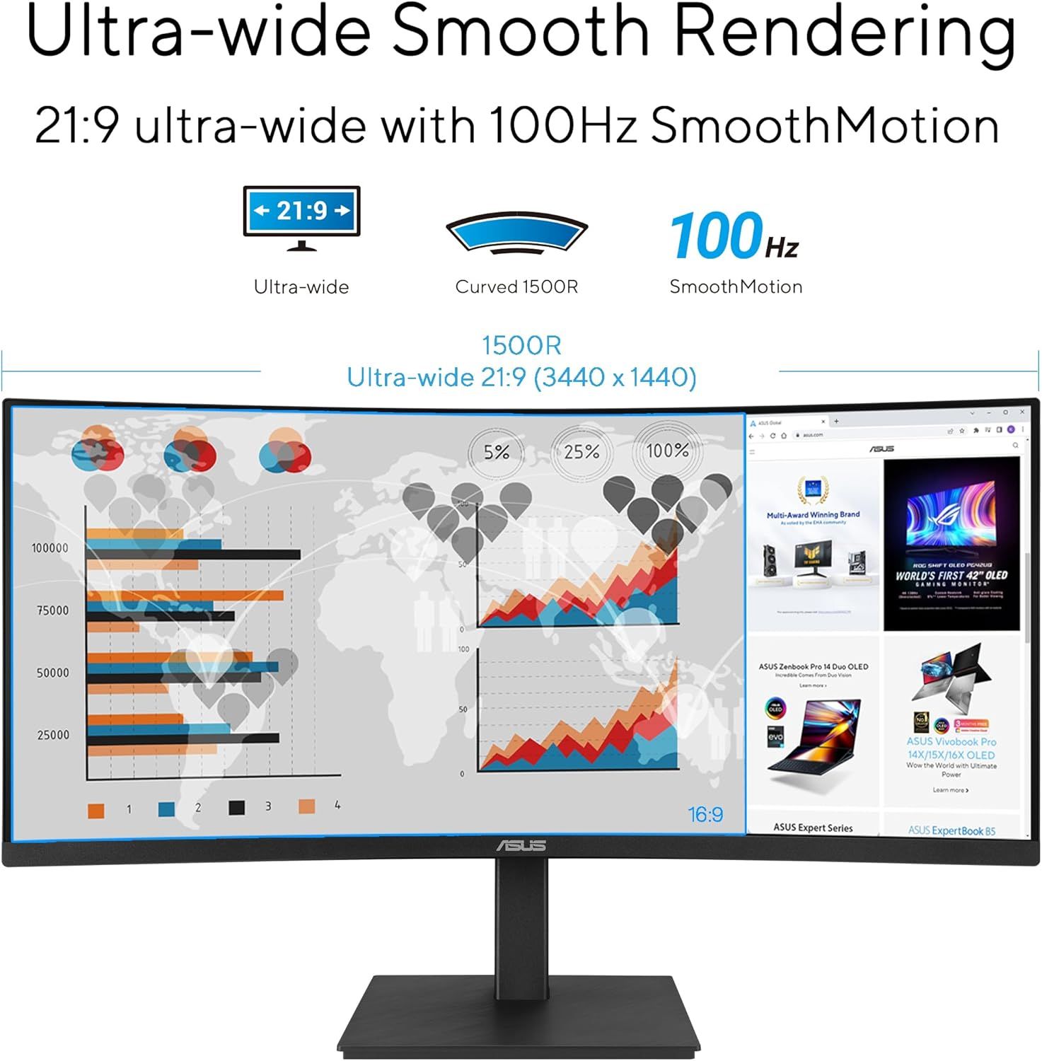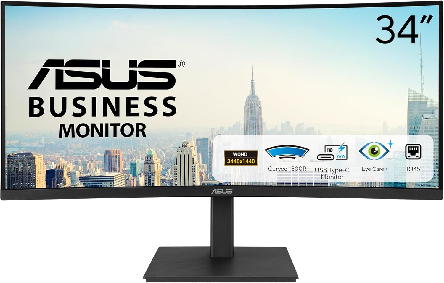 Монітор Asus 34" VA34VCPSR HDMI, DP, USB-C, 3xUSB, RJ-45, MM, VA, 3440x1440, 21:9, 100Hz, 4ms, CURVED, AdaptiveSync, HAS