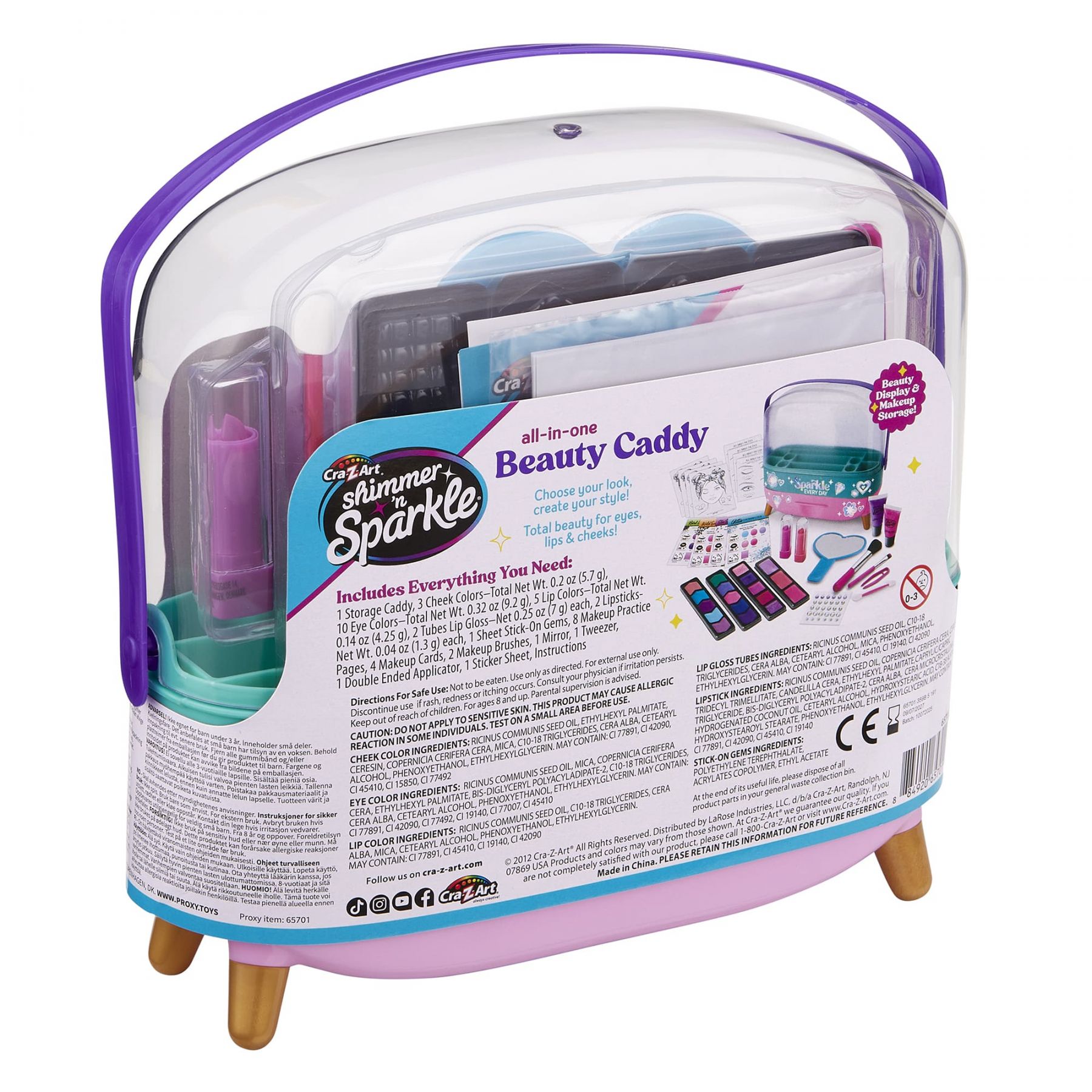Набір дитячої косметики Cra-Z-Art All in One Beauty Caddy Shimmer ’n Sparkle являє собою кейс із декоративною косметикою для творчих рольових ігор із макіяжем. Палітра містить відтінки для очей, губ і щік, а також аксесуари для нанесення косметики. Конструкція кейса з ручкою та прозорою кришкою використовується для зберігання косметичних засобів і аксесуарів та зручного перенесення.