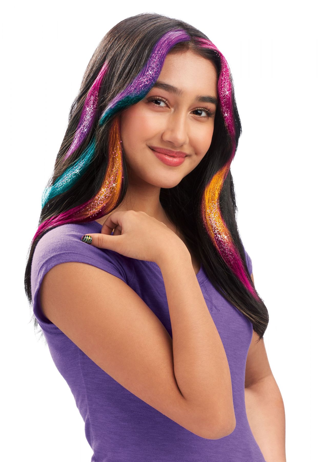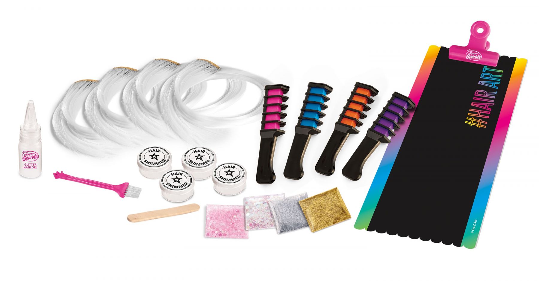 Комплектація:інструкція, 1 паличка для змішування, 1 пензлик для нанесення, 4 гребінці з крейдою для волосся, 4 накладні пасма на заколках, 1 гель для волосся з блиском (15 мл), 2 пакетики з глітером (по 1 г), 2 пакетики з паєтками (по 1,5 г), 4 білі заколки для нарощування, 1 дизайнерська дошка для фарбування, 1 додаткова заколка, 1 наклейка для декорування заколки, 4 прозорі контейнери з кришками