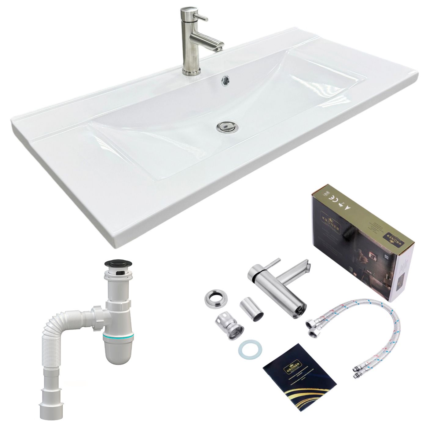 Набір для ванної кімнати Adamant QUANTO 100 складається з раковини зі штучного каменю, змішувача та сифона Click-Clack. Раковина прямокутної форми має розміри 100 х 44,7 х 14 см, білий колір та отвір для переливу. Змішувач Kroner KRP Edelstahl Klassisch ESG010 оснащено аератором, металевим важелем та стаціонарним виливом довжиною 12 см з хромовим покриттям. Сифон Soloplast Тюльпан 0515 забезпечує мокрий гідрозатвор, автоматичне відкриття зливу та функцію переливу.