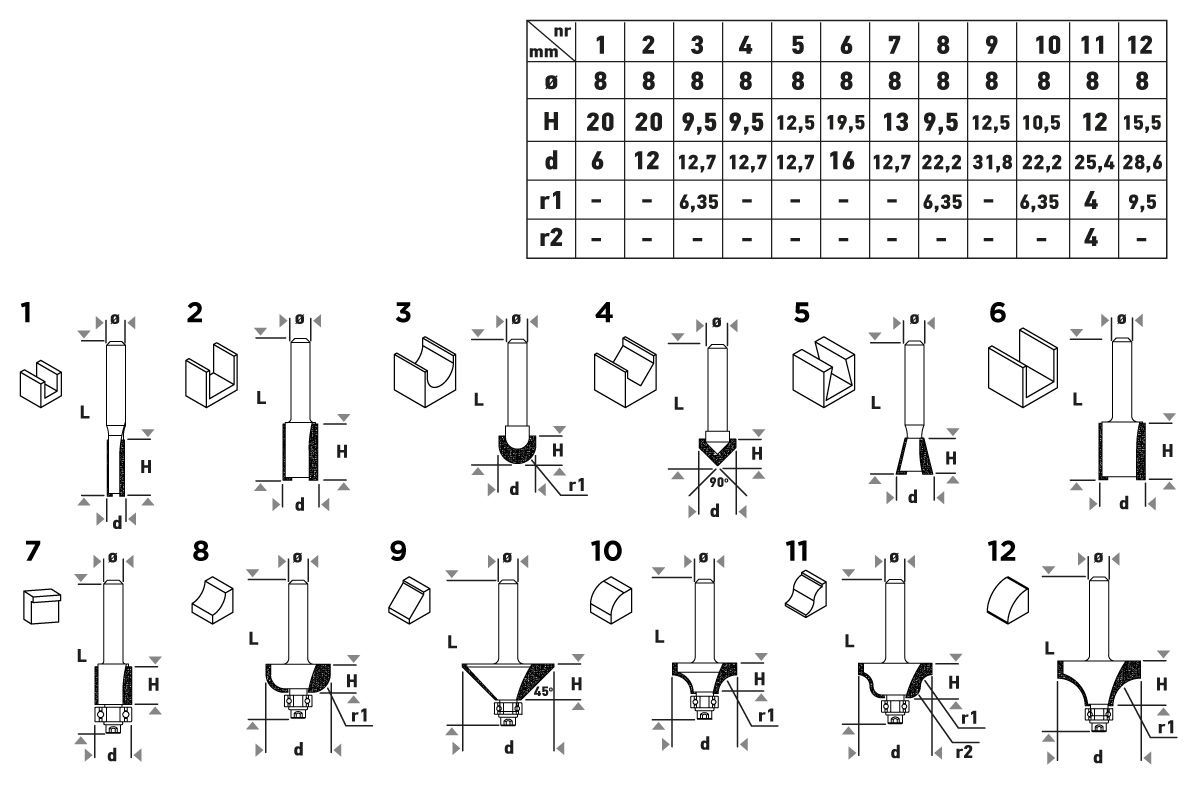 Набір фрез по дереву GRAPHITE WIDIA твердосплавні 8мм 12шт