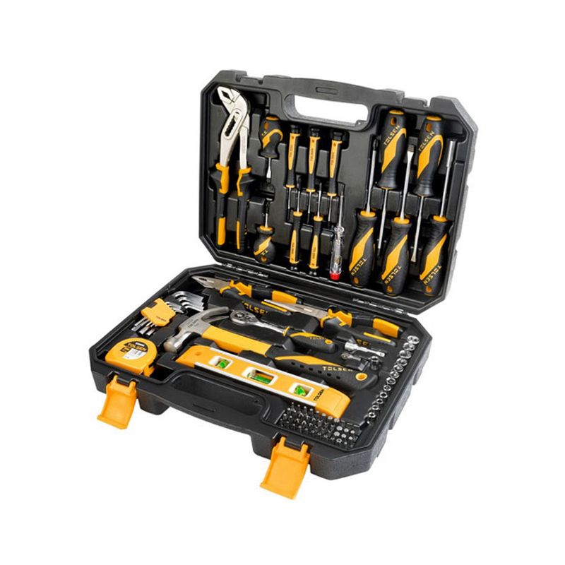 Набір інструментів Tolsen, 89 шт., універсальний 85352, включає в себе широкий асортимент інструментів для різних завдань. У комплект входять реверсивна тріскачка, викрутки різних типів і розмірів, прецизійні викрутки, тестер напруги, набір шестигранних ключів, комбіновані плоскогубці, плоскогубці для водяних насосів, вимірювальна стрічка, молоток, адаптери для біт, біти різних типів, головки, подовжувачі та міні-рівень. Усі інструменти зручно упаковані в корпус видувної форми для легкого зберігання та транспортування.