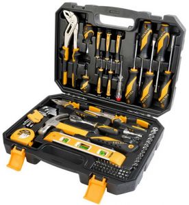 Комплектація:адаптер, кейс, упаковка, подовжувач, викрутки, молоток, плоскогубці, шестигранник, прецизійні викрутки, вимірювальна стрічка, тестер напруги, шестигранні ключі, міні-рівень, тріскачка 1/4", квадрат, викрутка для гайок