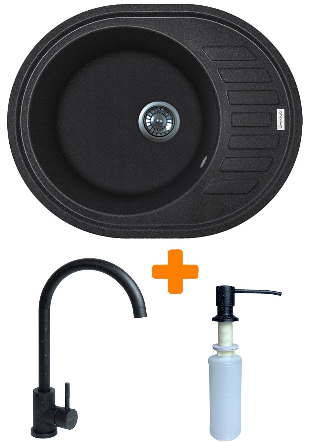 Набір кухонний Adamant Ovum, штучний камінь, овальна, з крилом, 615х495х200мм, чаша - 1, врізна, чорний + змішувач та дозатор