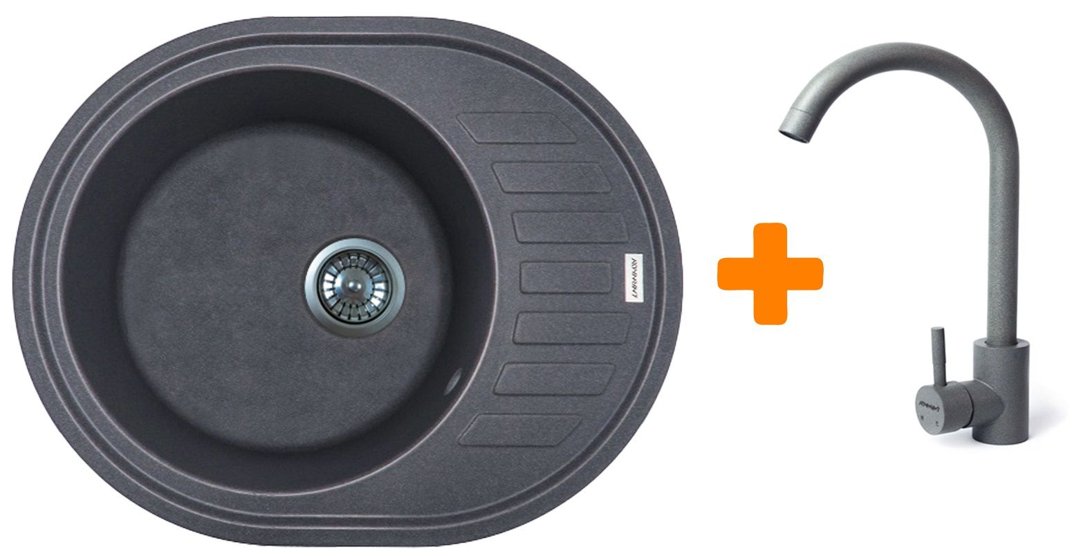 Набір кухонний Adamant Ovum, штучний камінь, овальна, з крилом, 615х495х200мм, чаша - 1, врізна, сірий + змішувач