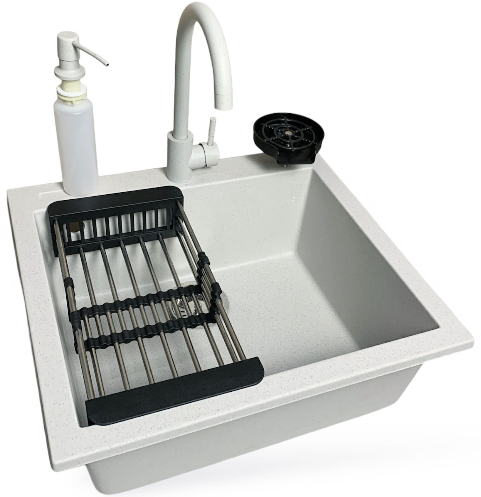 Набір Adamant Univer – це продумане рішення, яке об’єднує мийку зі штучного каменю, змішувач, дозатор, ополіскувач склянок та коландер. Квадратна форма та конструкція без крила дозволяють раціонально використати простір на кухні. Технологія Solid Surface забезпечує високу міцність, стійкість до подряпин і зручність у догляді. Додаткові аксесуари роблять щоденну роботу комфортнішою та підтримують порядок у робочій зоні. Комплект створений для тих, хто цінує функціональність та сучасні матеріали.