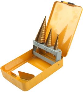 Набір свердел по металу Tolsen 75878 включає три східчасті свердла розмірів: 4-12×2 мм, 4-20×2 мм, 4-32×2 мм. Виготовлені з швидкорізальної сталі (HSS) з титановим покриттям для підвищення зносостійкості. Поставляється в зручному кейсі для зберігання.