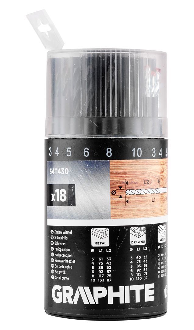 Набір свердел GRAPHITE призначений для свердління металу, деревини та цегли під час побутових і монтажних робіт. Найпопулярніші діаметри 3–6 мм, 8 мм та 10 мм дозволяють виконувати більшість завдань без додаткової оснастки. Комплект є оптимальним рішенням для домашньої майстерні та ремонту.