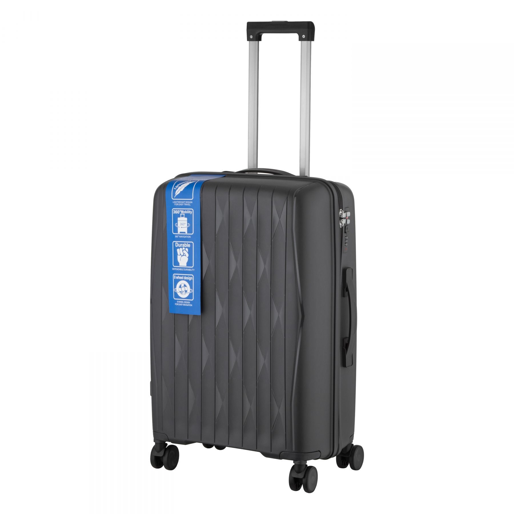 Особливості:подвійні колеса з обертанням на 360 градусів, захисна блискавка (anti-theft), передбачено розділювачі та регульовані пакувальні паски всередині, тканинний розділювач на блискавці
