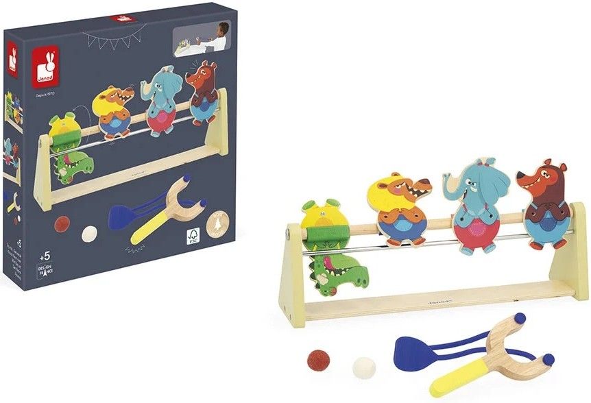 Дерев’яна гра на спритність для дітей від 5 років. Запускайте фетровим м’ячиком із рогаткоподібного запускачa й збивайте магнітні тварини-мішені заввишки 11 см, дистанцію можна змінювати під рівень складності. У комплекті 2 м’ячі. Деревина з сертифікацією FSC™.