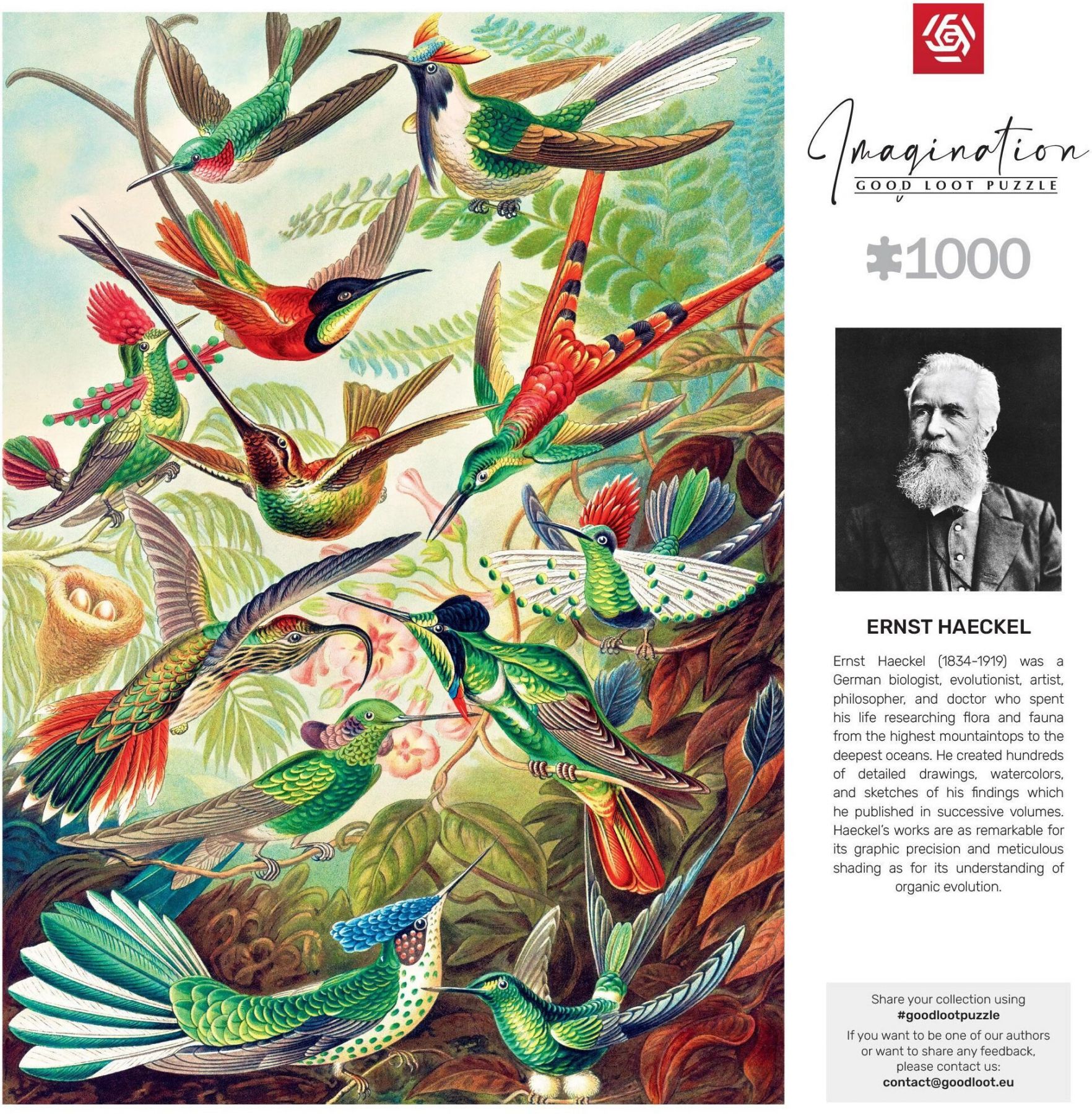 Пазл з ілюстрацією Ернста Геккеля «Колібрі», 1000 елементів. Ернст Геккель (1834-1919) був німецьким біологом, еволюціоністом, художником, філософом і лікарем, який провів своє життя, досліджуючи флору і фауну від найвищих вершин гір до найглибших океанів. Він створив сотні детальних малюнків, акварелей і ескізів своїх висновки, які він опублікував у наступних томах. Роботи Геккеля вражають своєю графічною точністю та ретельним штрихуванням, а також розумінням органічної еволюції.