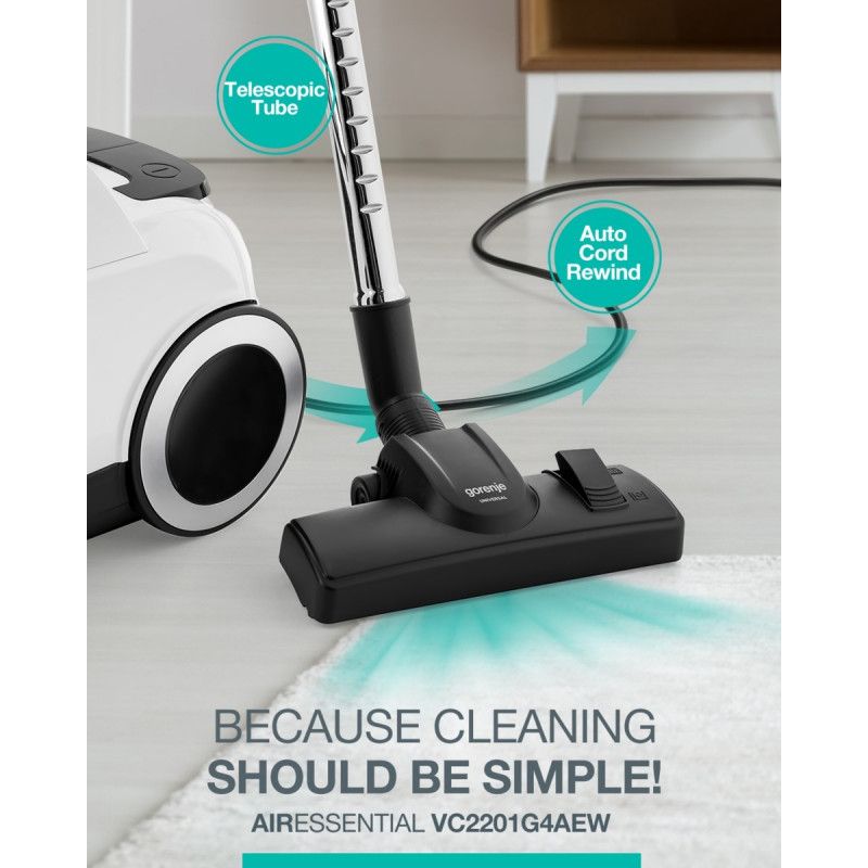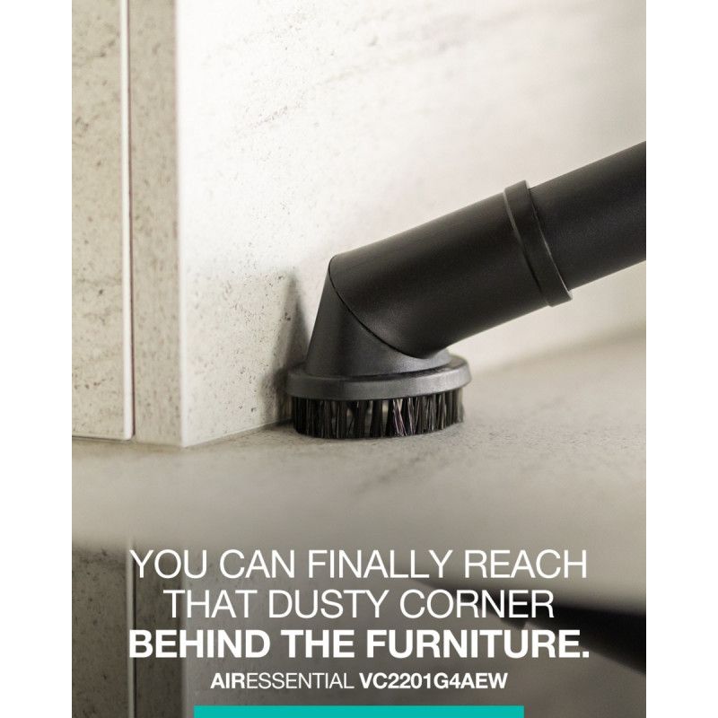 Пилосос AIRESSENTIAL потужністю двигуна 2200 Вт забезпечує ефективне сухе прибирання. Сила всмоктування 330 Вт і потік повітря 33,3 л/сек дозволяють швидко збирати пил і дрібне сміття. Пластиковий контейнер 3,3 л і телескопічна металева трубка роблять прилад зручним у використанні. Три гумові колеса та захисний бампер оберігають меблі та забезпечують легке пересування.