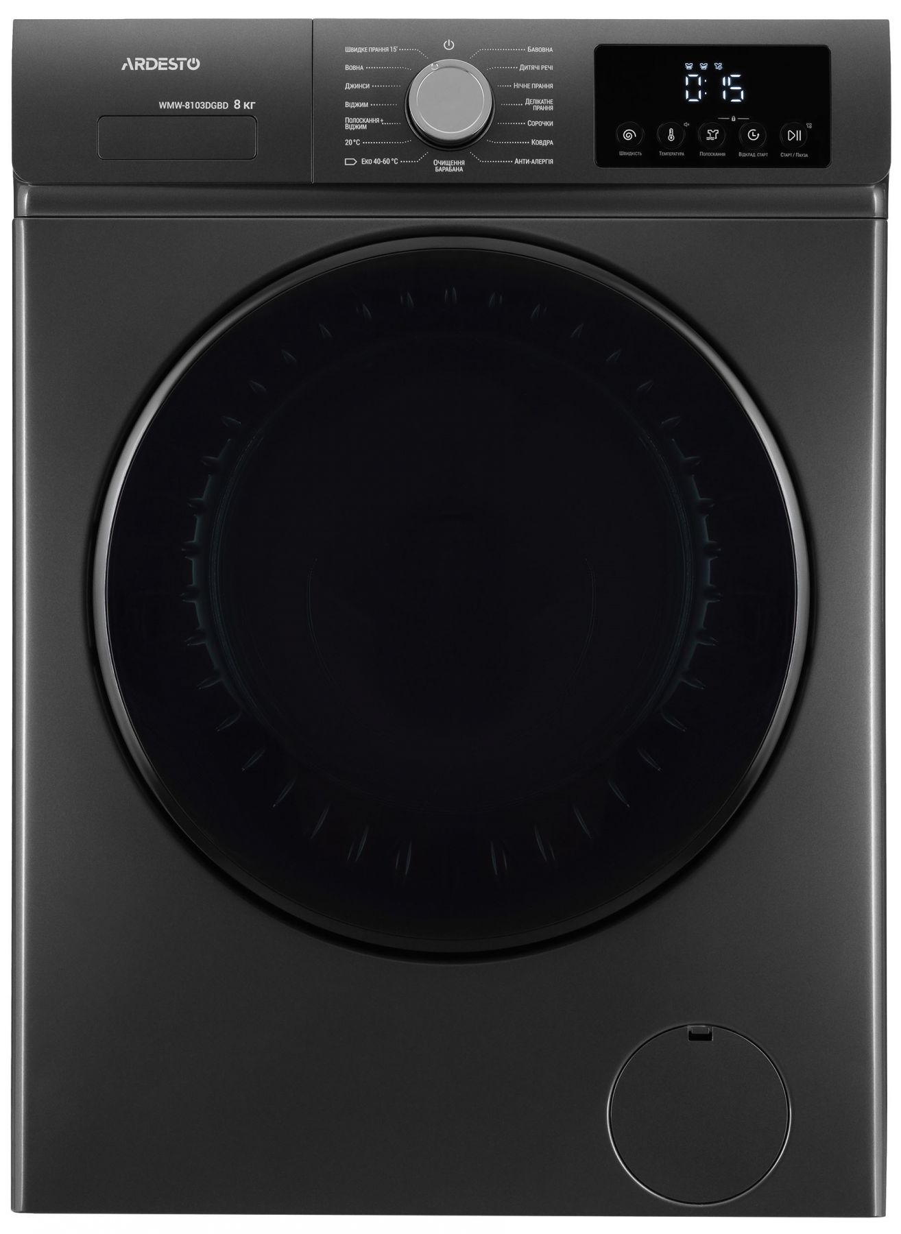 Фронтальна пральна машина ARDESTO Black Mars з інверторним двигуном BLDC вміщує 8 кг білизни та працює зі швидкістю до 1 200 об/хв. Модель вирізняється енергоефективністю класу А+++ та низьким рівнем шуму – 62 дБ під час прання і 75 дБ за віджимання. Передбачено 16 програм, з-поміж яких: «Еко 40–60 °C», «Делікатне прання», «Речі дітей», «Вовна», «Ковдра», «Джинси» та «Швидкий цикл 15'». Функція прання парою освіжає тканини й усуває алергени, а цифровий дисплей, відкладений старт, блокування панелі й можливість додавання білизни під час циклу забезпечують зручність і контроль процесів.