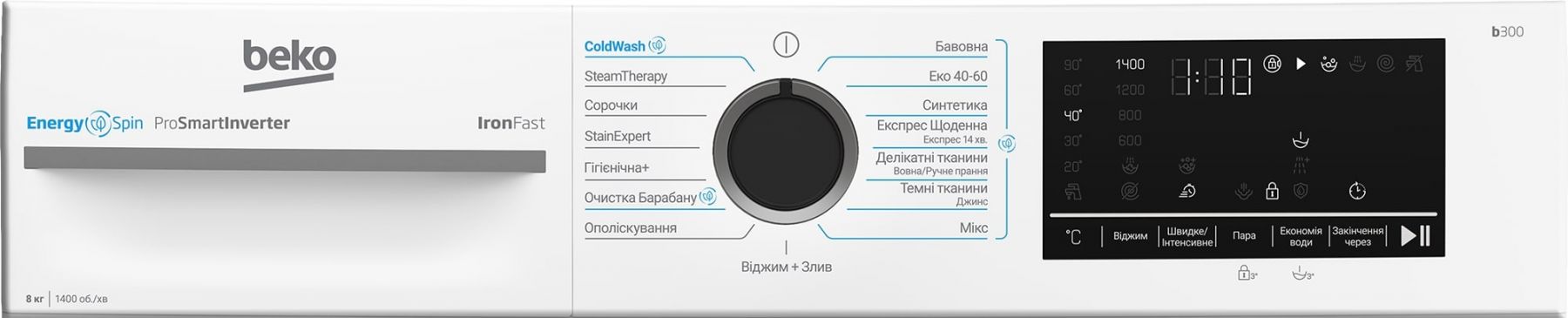 Програми:Бавовна, Синтетика, Мікс, Очищення барабана, StainExpert, ополіскування, Еко 40-60, Експрес Щоденна/Експрес 14 хв, Темний одяг/Джинси, Сорочки, гігієнічна +, Віджим + Злив, Прання в холодній воді, SteamTherapy, Делікатні тканини /Вовна/Ручне прання