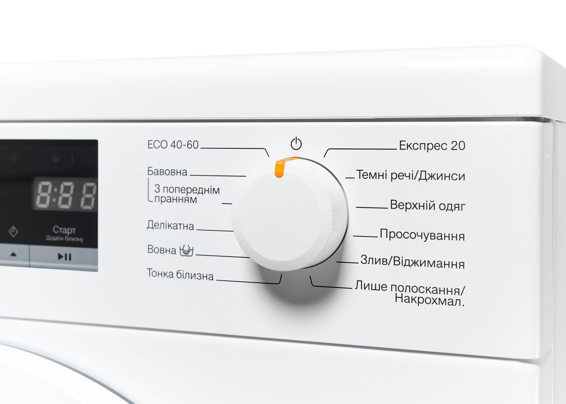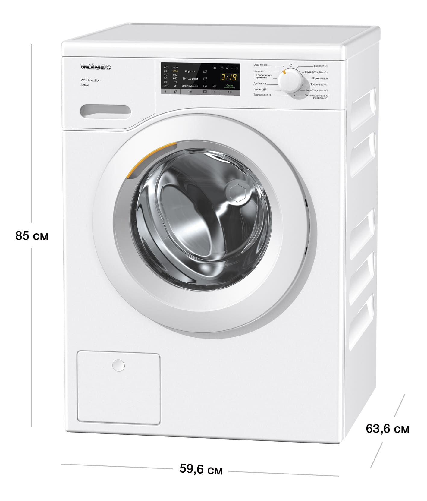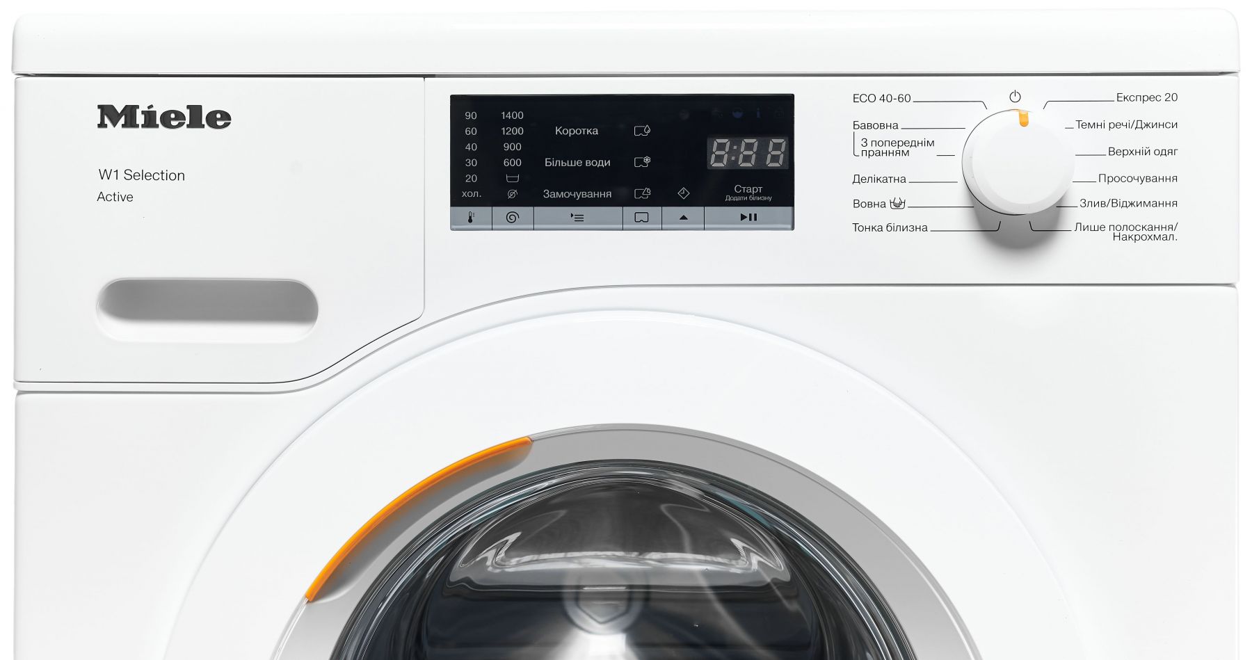 Програми:Бавовна, Вовна, Верхній одяг, Делікатна, Додаткове полоскання, Еко 40-60, темні речі, Тонка білизна, Тільки полоскання, Низькотемпературне прання «холодне» 20°C, Експрес 20, Накрохмалювання, Просочення, Злив / віджим