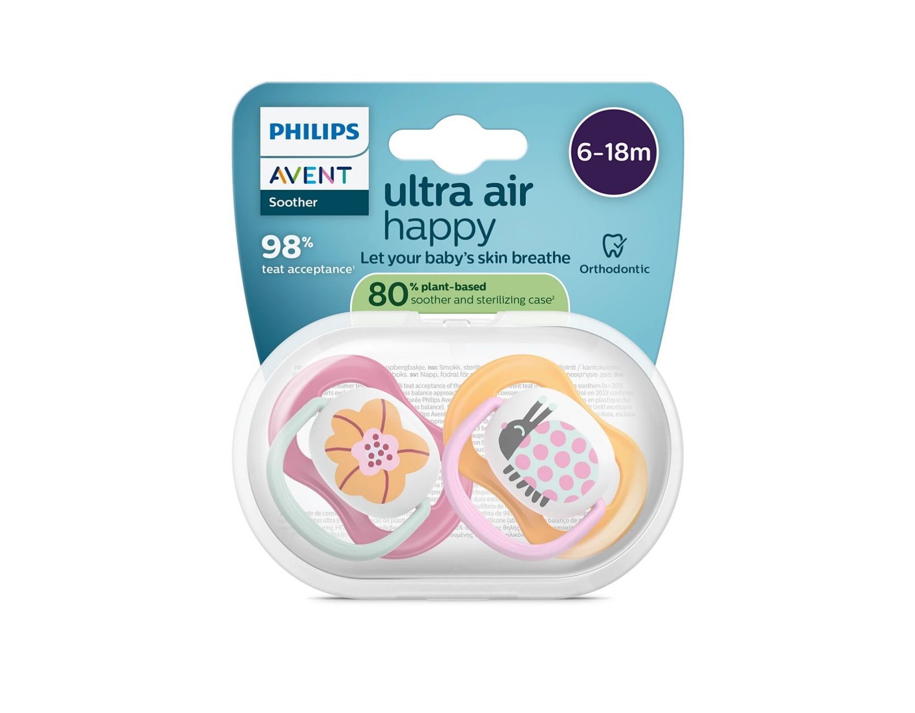 Пустушка Philips Avent Ultra Air 6–18 міс. (2 шт.) має надзвичайно великі вентиляційні отвори, щоб шкіра могла «дихати» та залишалась сухішою. Ортодонтична симетрична соска зі 100% харчового силікону підтримує природний розвиток ротової порожнини. Текстурований силікон дає знайоме відчуття та високу прийнятність у дітей. У комплекті футляр для швидкої стерилізації у мікрохвильовій печі.
