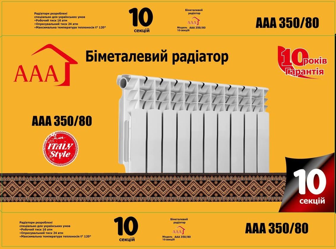 Радіатор біметалевий AAA 350/80 10 секции 406х78.5х80мм боковое підкл. 1250 Вт білий