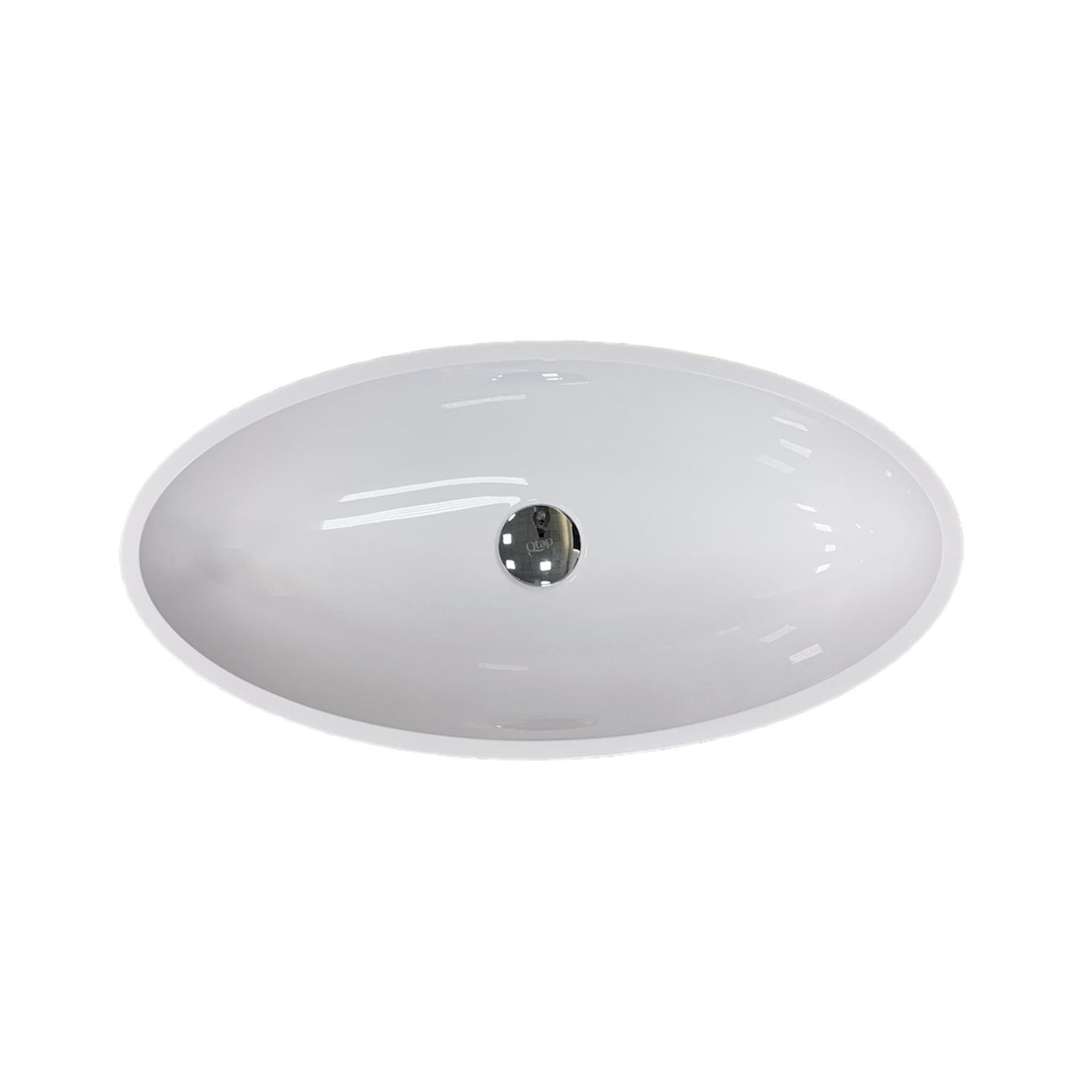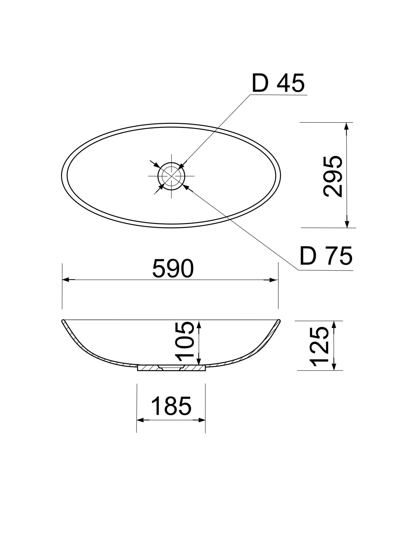 Раковина Adamant ANDERE NEW має овальну форму, виготовлена зі штучного каменю з розмірами 590 x 295 x 130 мм та чорно-білим кольором. Накладний тип встановлення без отвору для змішувача та переливу дозволяє гнучкий монтаж на стільницю чи тумбу. Матеріал складається з 80% литого каменю та 20% сантехнічної штучної кераміки, стінки товщиною до 20 мм. Поверхня гладка, стійка до барвників та хімічних речовин, витримує температуру до +165°C.