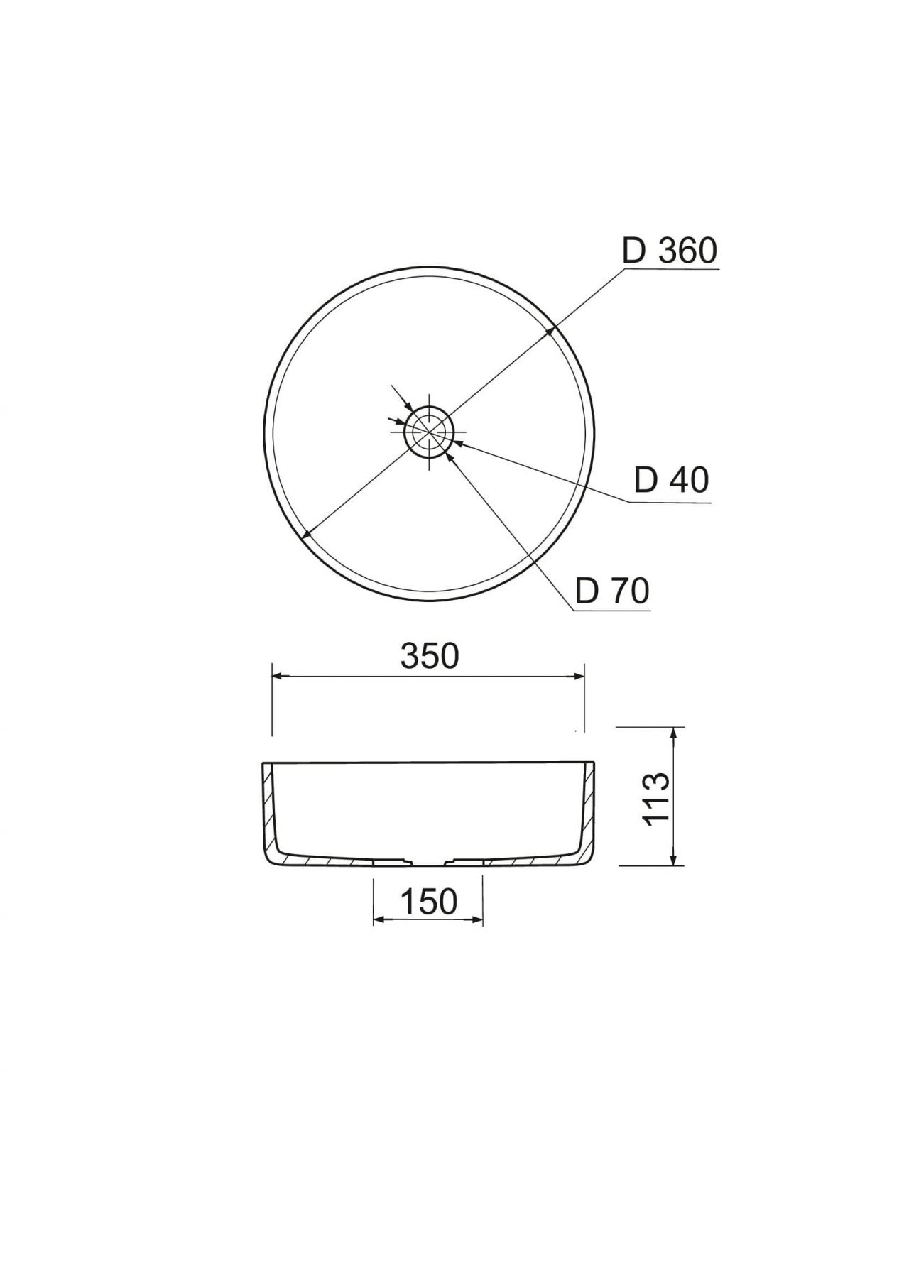 Раковина Adamant ARENA має круглу форму, виготовлена зі штучного каменю з розмірами 360 x 113 мм та білим кольором. Накладний тип встановлення без отвору для змішувача та переливу дозволяє монтаж зверху на стільницю. Матеріал створений за технологією Solid Surface, стійкий до впливу та довговічний.