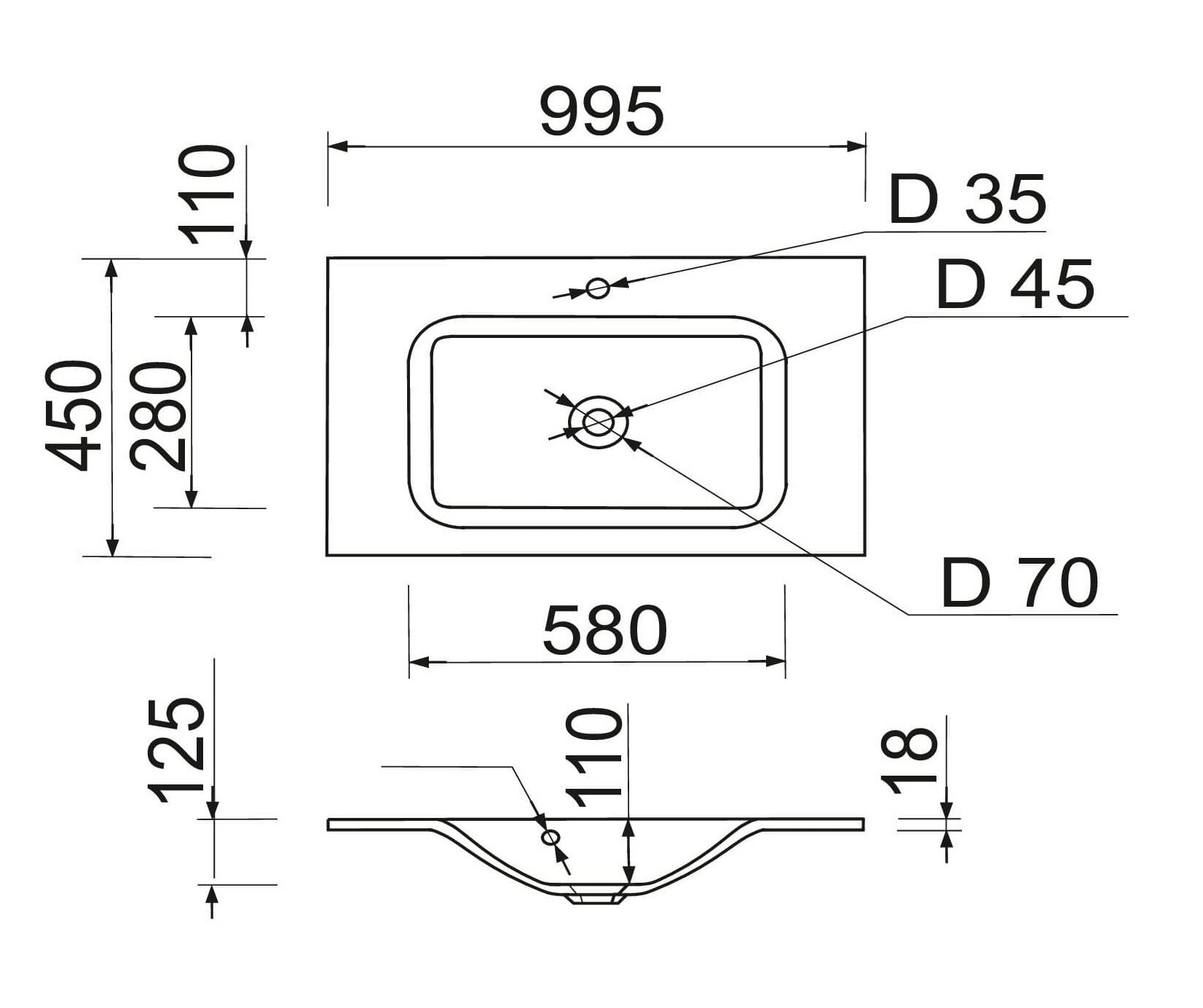 Раковина Adamant FRATE має прямокутну форму, виготовлена зі штучного каменю з розмірами 995 x 450 x 125 мм та білим кольором. Накладний тип встановлення з отворами для змішувача та переливу дозволяє монтаж на тумбу. Матеріал створений за технологією Solid Surface, стійкий до впливу та довговічний.