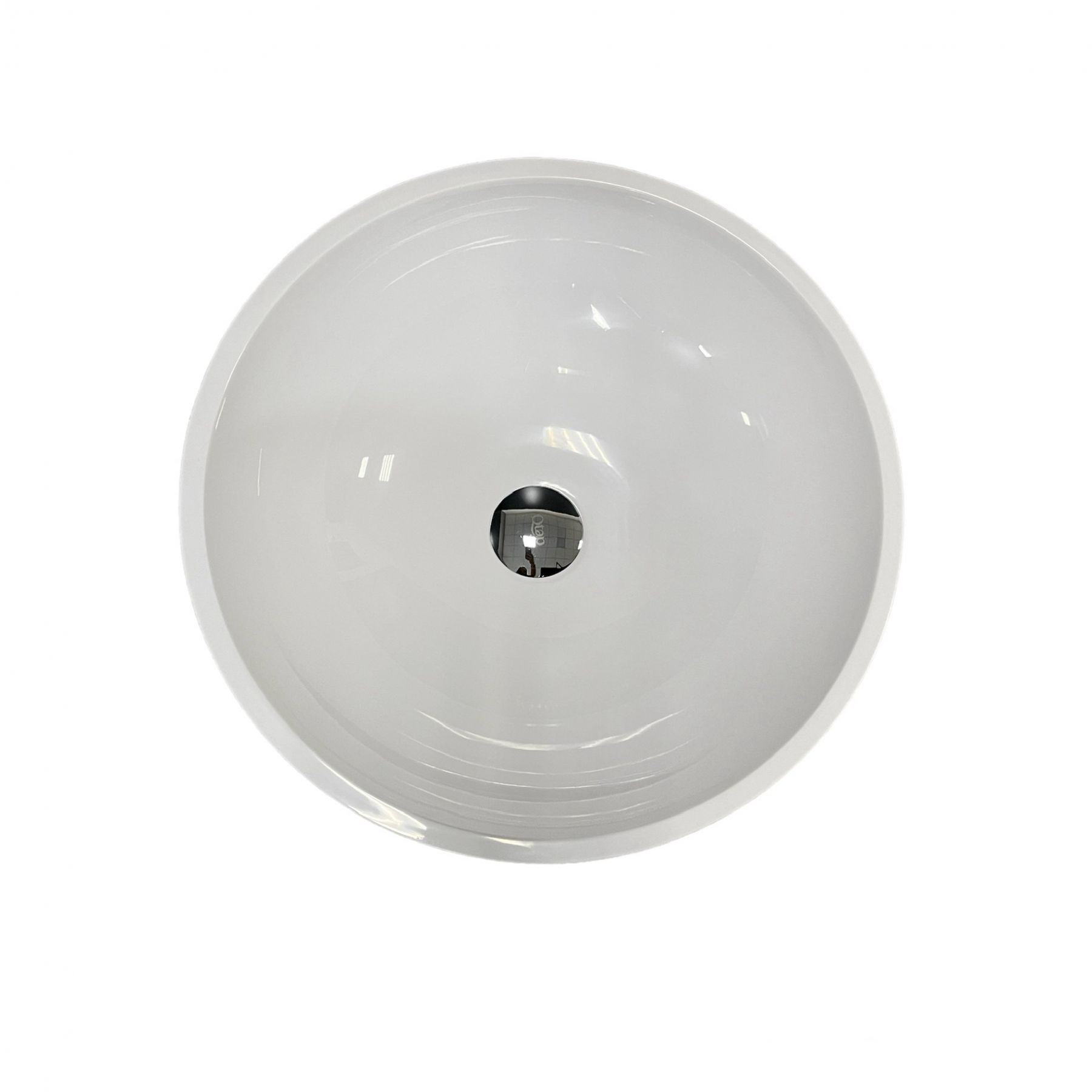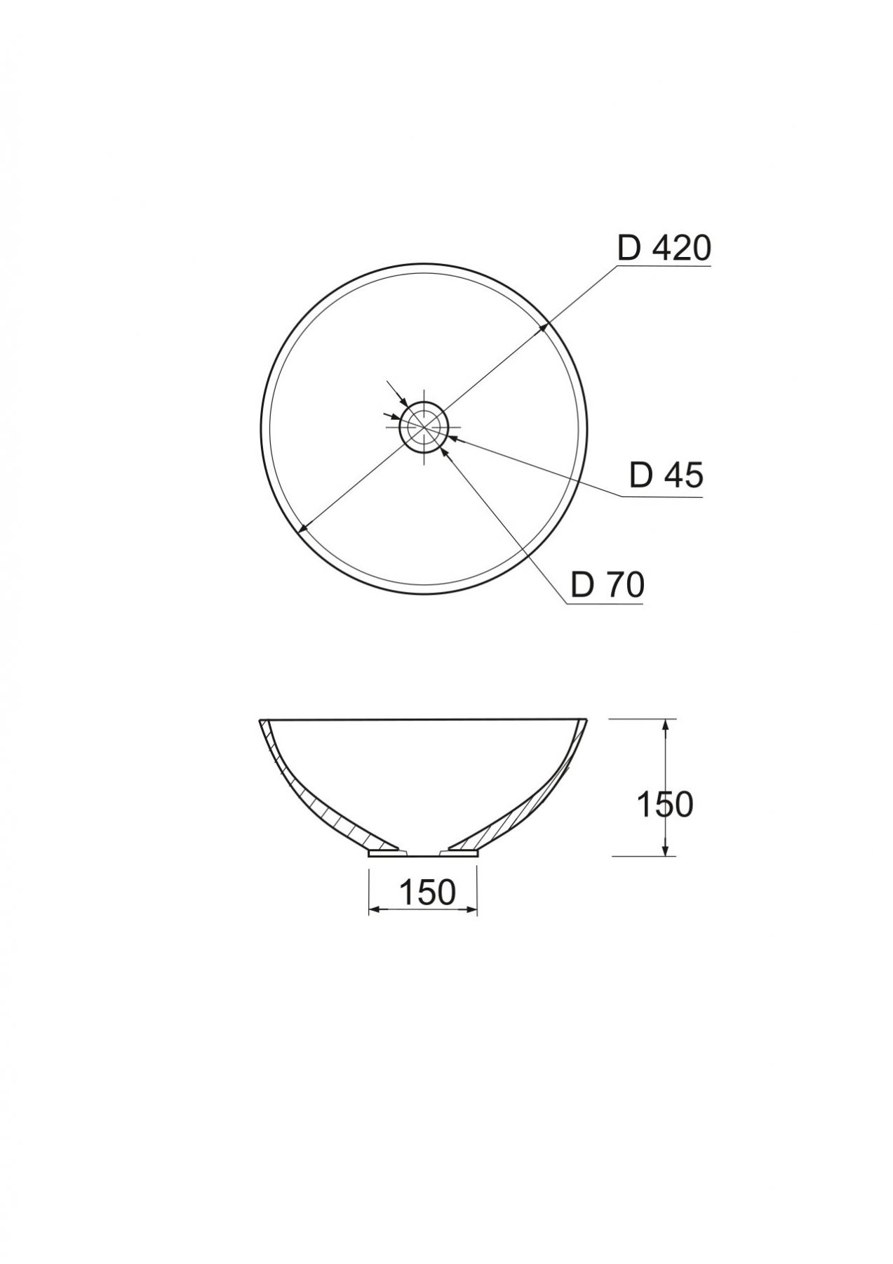 Раковина Adamant KREIS має круглу форму, виготовлена зі штучного каменю з розмірами 420 x 150 мм та чорно-білим глянцевим кольором. Накладний тип встановлення без отвору для змішувача та переливу дозволяє монтаж зверху на стільницю. Матеріал створений за технологією Solid Surface, стійкий до впливу та довговічний.