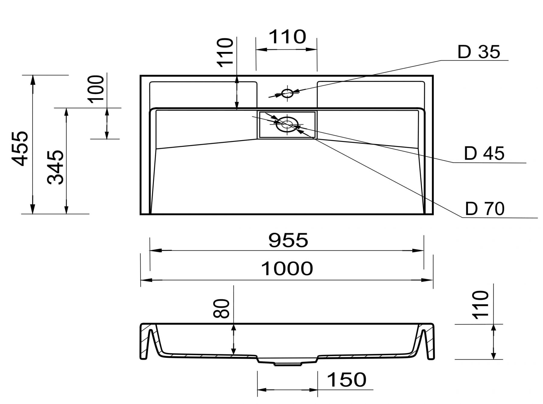 Раковина Adamant VISION має прямокутну форму, виготовлена зі штучного каменю з розмірами 1000 x 455 x 110 мм та білим кольором. Накладний тип встановлення з отвором для змішувача та без отвору для переливу дозволяє монтаж на тумбу. Матеріал створений за технологією Solid Surface, стійкий до впливу та довговічний.