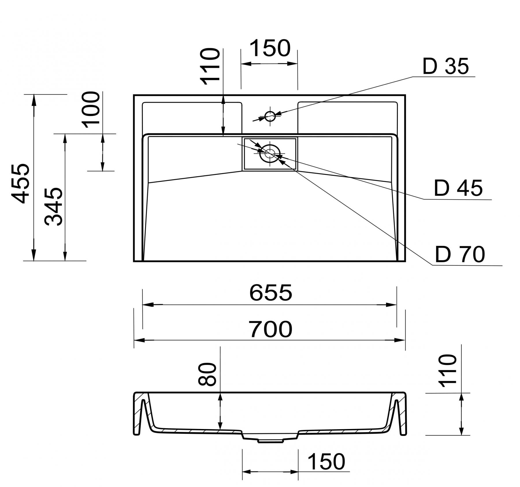 Раковина Adamant VISION має прямокутну форму, виготовлена зі штучного каменю з розмірами 700 x 455 x 110 мм та білим кольором. Накладний тип встановлення з отвором для змішувача та без отвору для переливу дозволяє монтаж на тумбу. Матеріал створений за технологією Solid Surface, стійкий до впливу та довговічний.