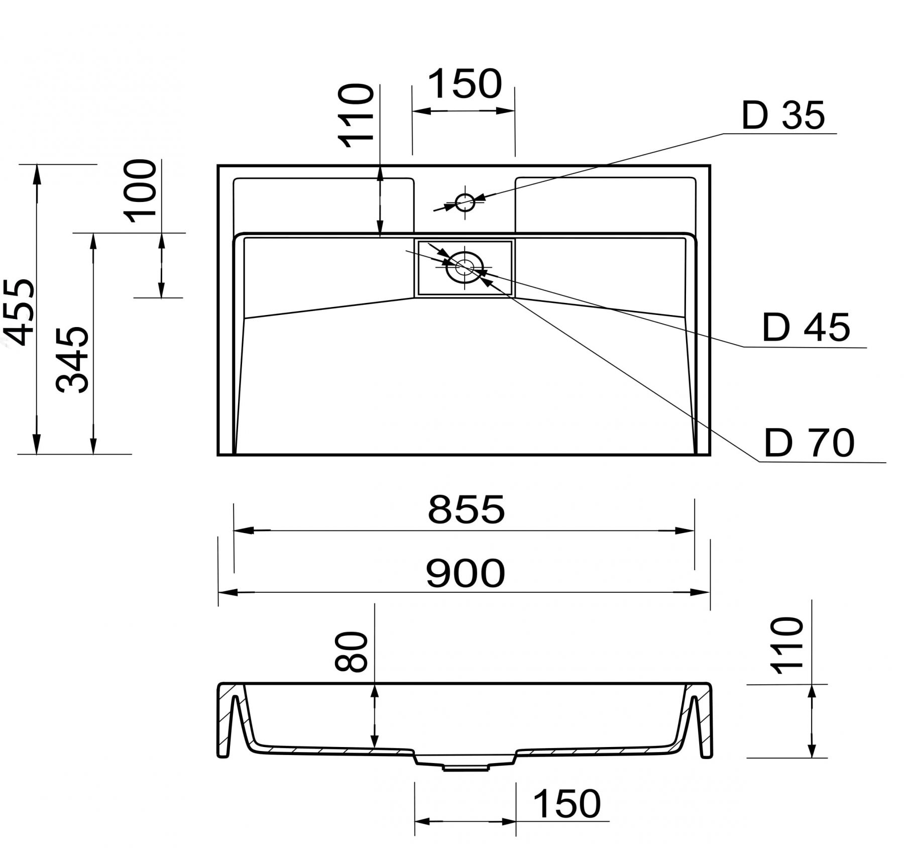 Раковина Adamant VISION має прямокутну форму, виготовлена зі штучного каменю з розмірами 900 x 455 x 110 мм та білим кольором. Накладний тип встановлення з отвором для змішувача та без отвору для переливу дозволяє монтаж на тумбу. Матеріал створений за технологією Solid Surface, стійкий до впливу та довговічний.