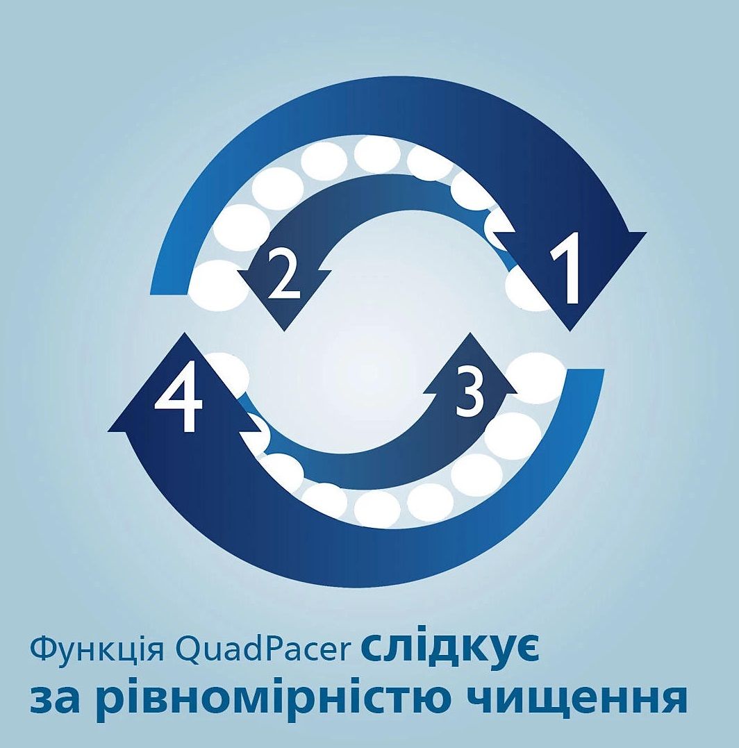Додаткові функції:таймер, індикатор зарядки, SmarTimer, реакція на надмірний тиск, світлодіодний індикатор стану батареї, нагадування про заміну BrushSync, датчик тиску, функція підключення BrushSync, 3 режими, функція Quadpacer