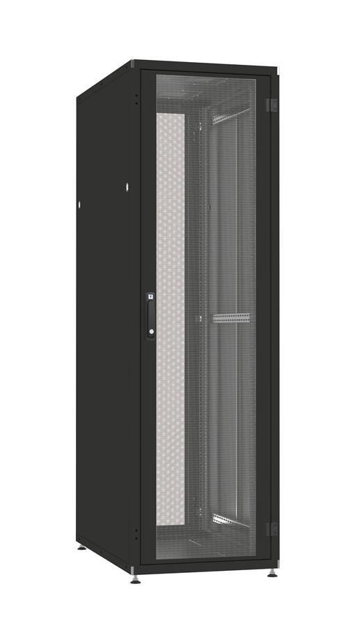 Комплектація:збірна несуча конструкція, шина і дроти заземлення, регульовані ніжки, двері передні і задні металеві, перфоровані (просвіт 80%) з триточковим замком і ручкою, дві бічні, суцільні стінки з одноточковим замком, дві пари монтажних профілів на відстані 19"
