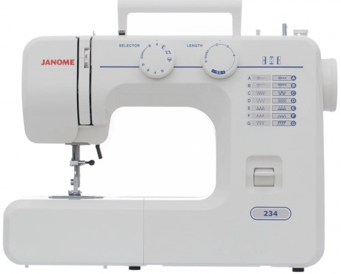 Надійна побутова швейна машинка JANOME 234 для всіх видів тканин. Належить до бюджетного класу побутових швейних машин для ремонту одягу і нескладного пошиття. JANOME 234 оснащена 15 швейними операціями і класичним вертикальним човником. Легка та проста у використанні — це ідеальна модель для початківців, яка містить усі необхідні аксесуари для старту роботи.