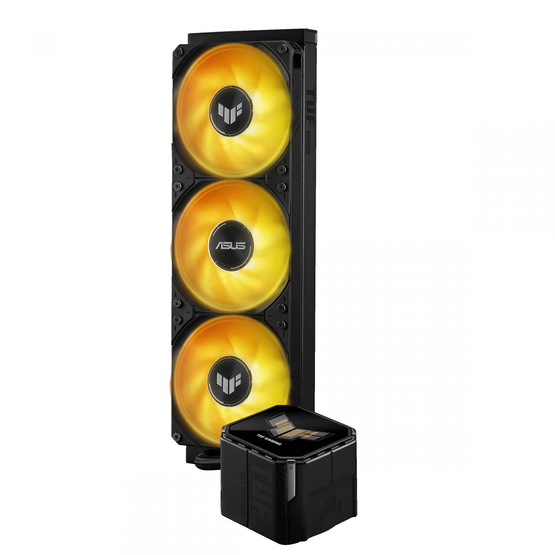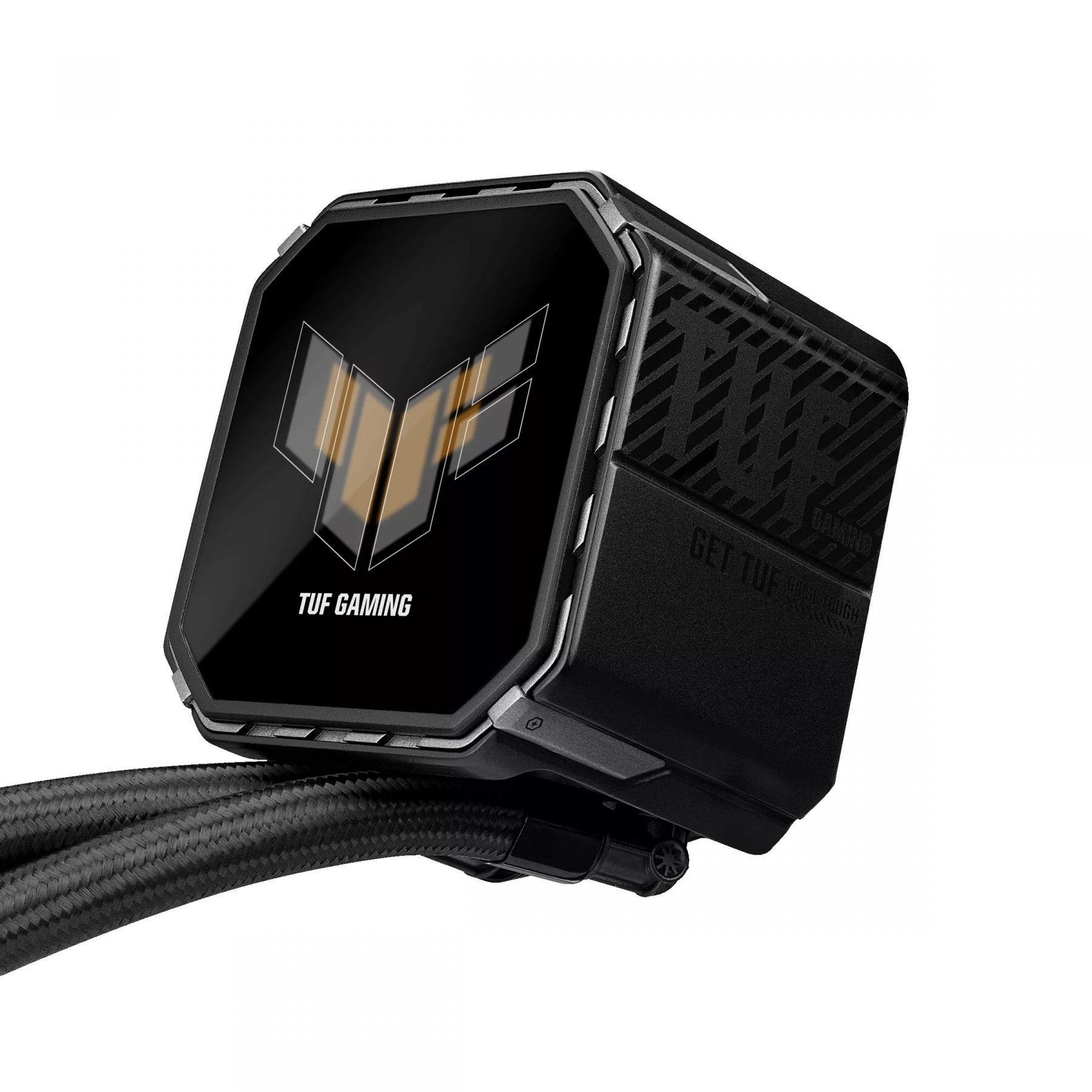 ASUS TUF Gaming LC III 360 ARGB LCD — рідинна система охолодження процесора з 360-мм радіатором і трьома 120-мм ARGB-вентиляторами для ефективного тепловідведення. Оснащена 2,8″ IPS-дисплеєм, який відображає дані моніторингу в реальному часі або користувацький контент (зображення, GIF, MP4). Помпа з оптимізованою конструкцією та попередньо нанесеною термопастою забезпечує стабільну роботу під високими навантаженнями. Посилені шланги з нейлоновим обплетенням підвищують довговічність, а сумісність із Intel LGA 1851/1700/1200 і AMD AM5/AM4 робить систему універсальною. Підтримує синхронізацію підсвічування через Aura Sync.
