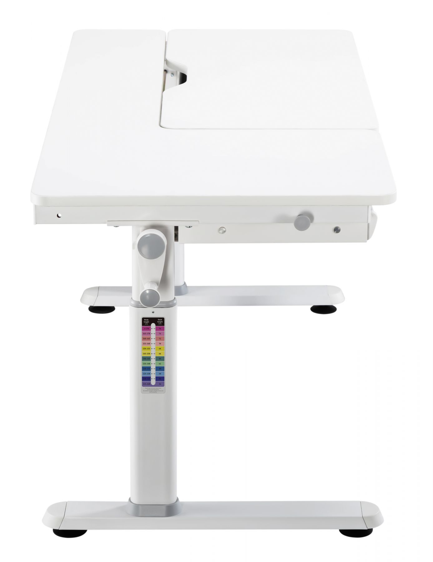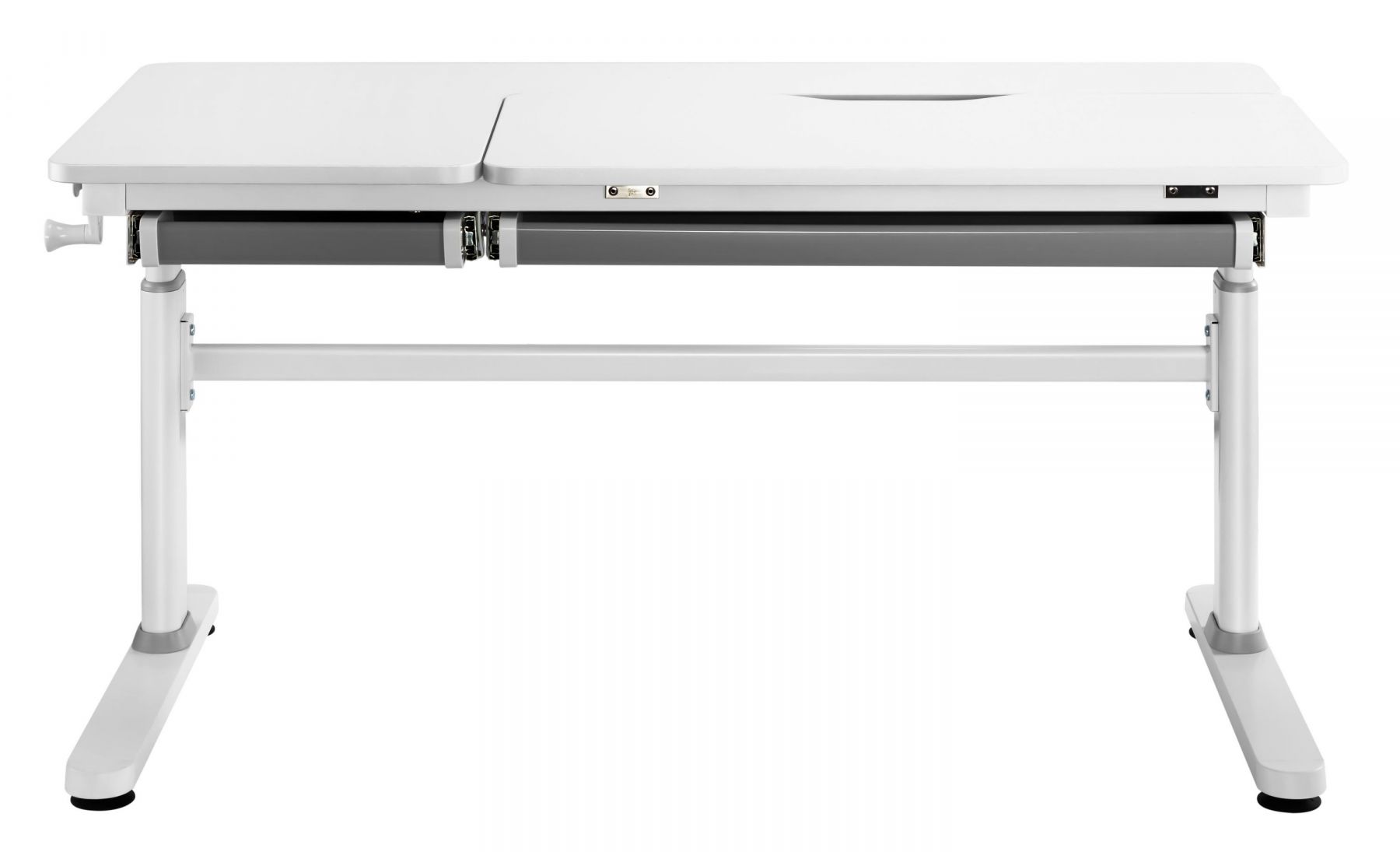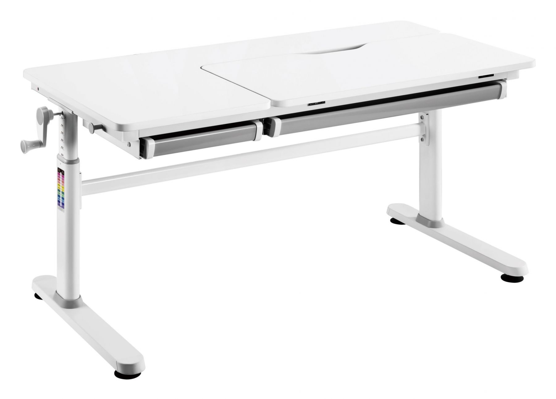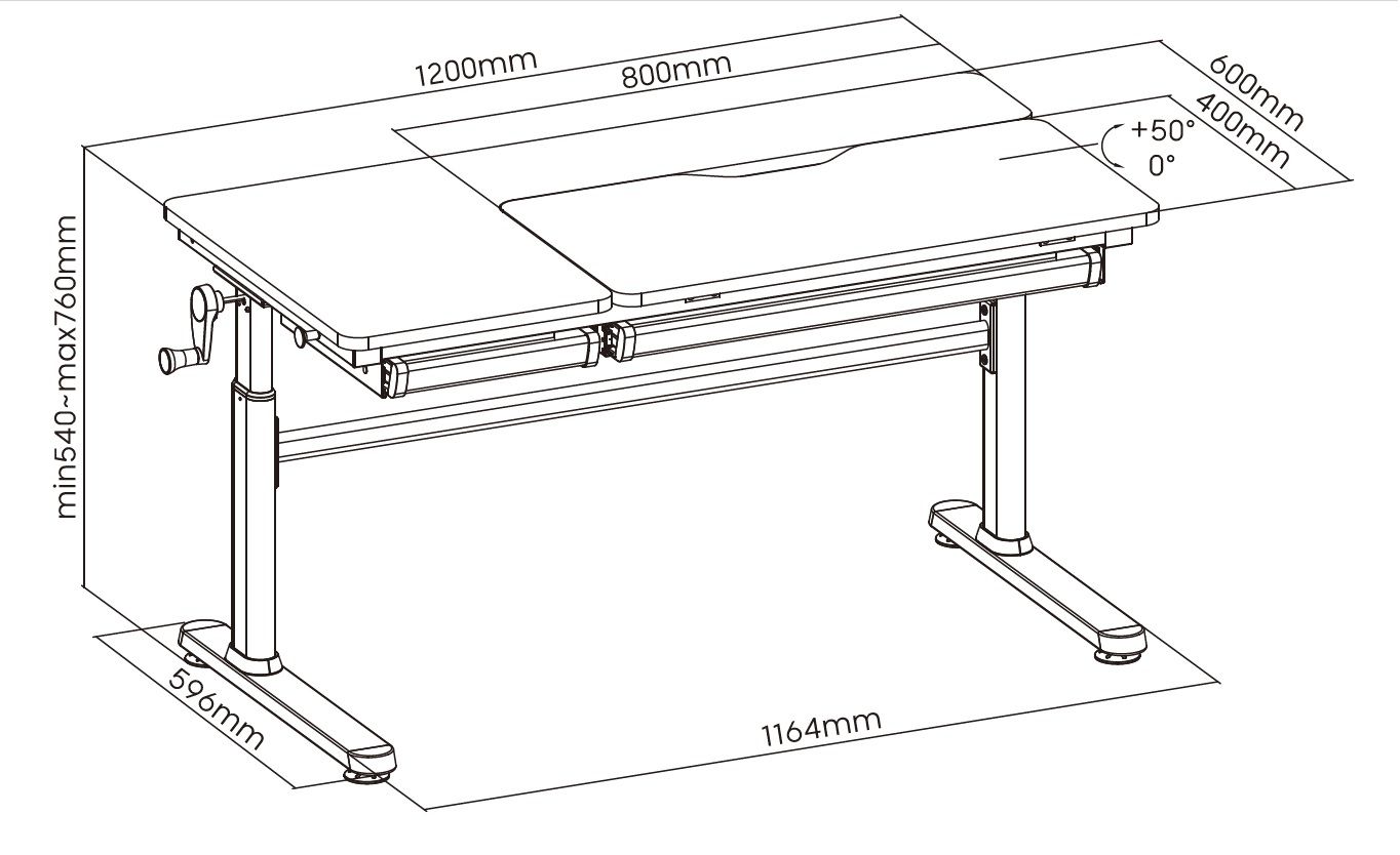 Стіл 2E CE301 стане в пригоді для навчання та творчості. Виріб зручний і надійний за щоденного користування. Розмір становить 1 200 × 600 мм, можна регулювати за висотою від 540 до 760 мм. Стільниця нахиляється до 50° – це зручно під час письма, читання чи малювання. Нахильна частина 800 × 400 мм, стільниця завтовшки – 18 мм. Витримує навантаження до 100 кг. Оснащено ручкою-кривошипом, пневмомеханізмом, захистом від защемлення пальців, шухлядою, гачком для речей і ніжками-локерами. Поверхня матова, біла, не відблискує.