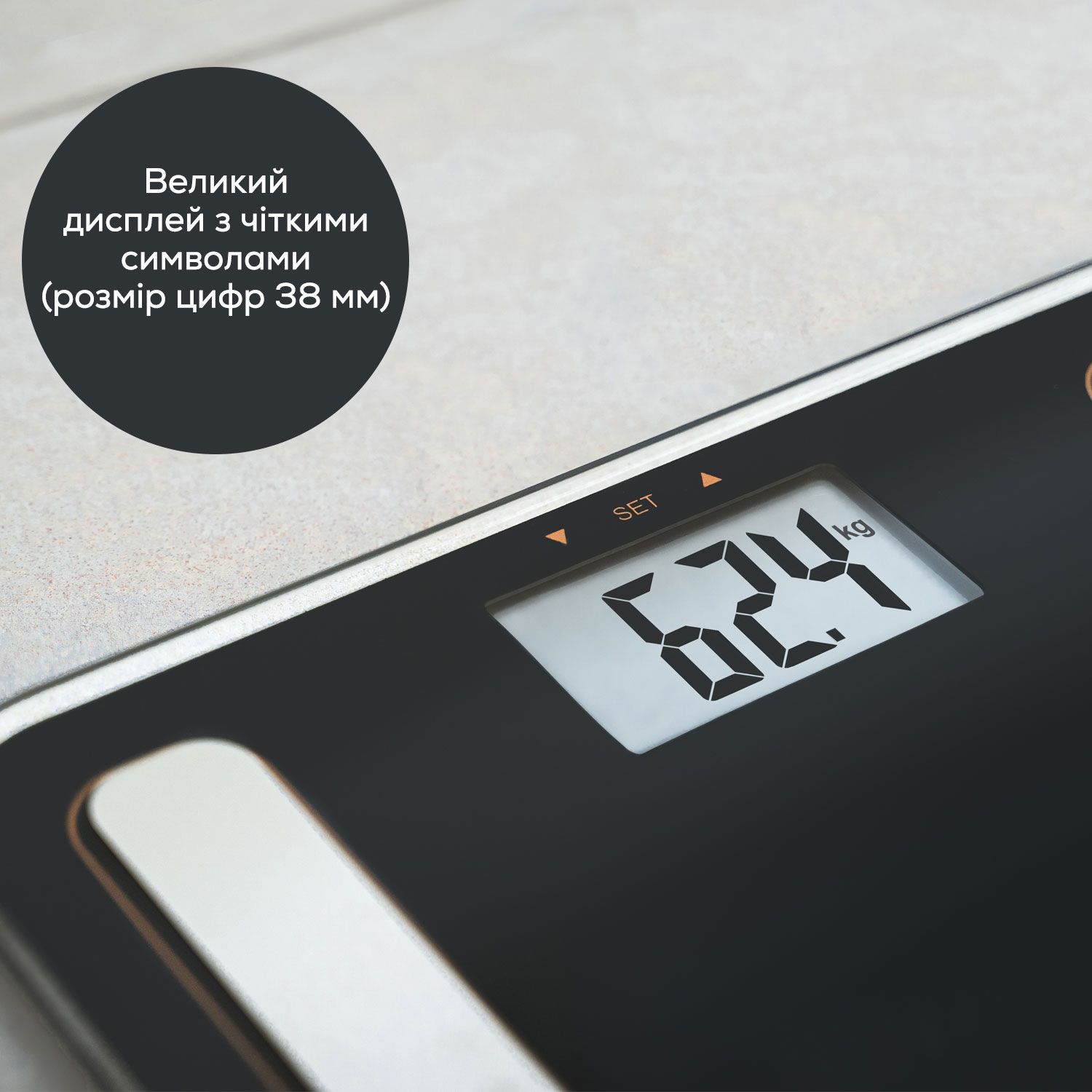 Підлогові смарт ваги, що поєднують стильний дизайн та точність. Визначають вагу та аналізують склад тіла, включаючи вісцеральний жир та метаболічний вік. Максимальна вага до 180 кг, зручно для користувачів різної комплекції. Великий дисплей забезпечує легке читання результатів. Ваги мають пам’ять на 10 користувачів для зберігання даних. Автоматичне ввімкнення спрощує користування.