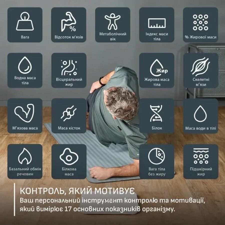 Діагностичні можливості:Метаболічний вік, Підшкірний жир, кісткова маса, вага тіла, маса жиру, м’язова маса, вміст води в організмі, безжирова маса тіла, вісцеральний жир, базальний метаболізм, відсоток жиру, рівень білка, скелетні м’язи, маса води в організмі, індекс маси тіла, частка м’язової маси, маса білка